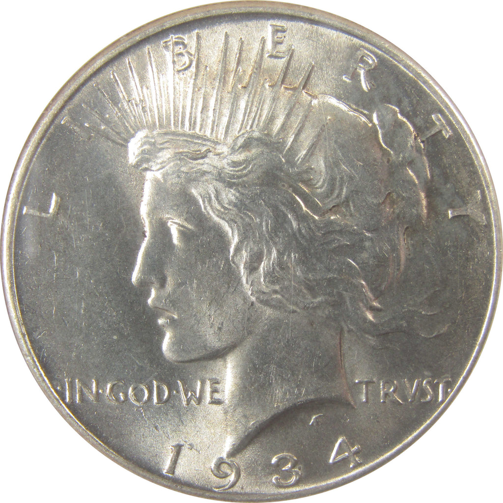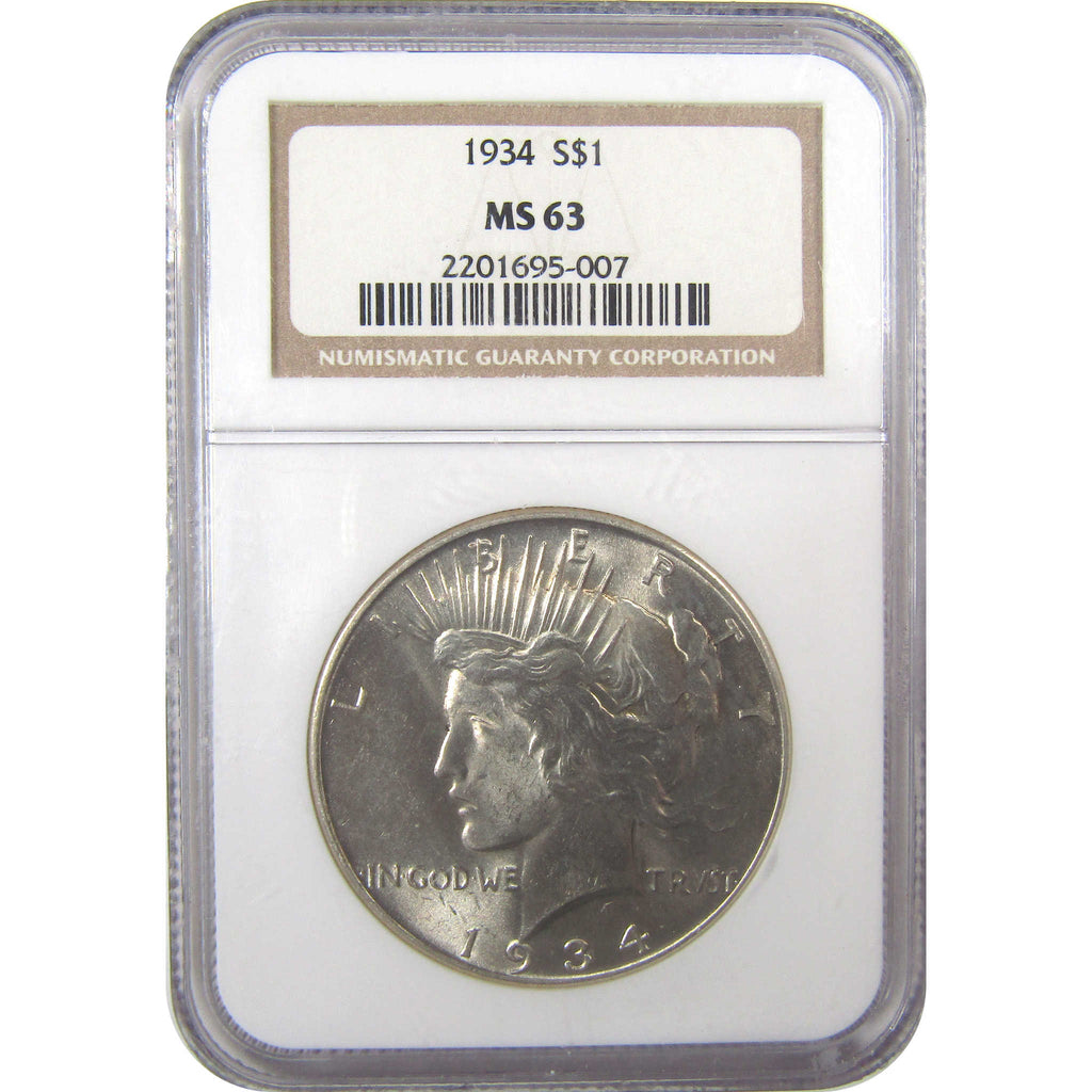 A genuine 1934 Peace Silver Dollar Coin, graded and certified MS 63 by NGC. Contains 90% Silver