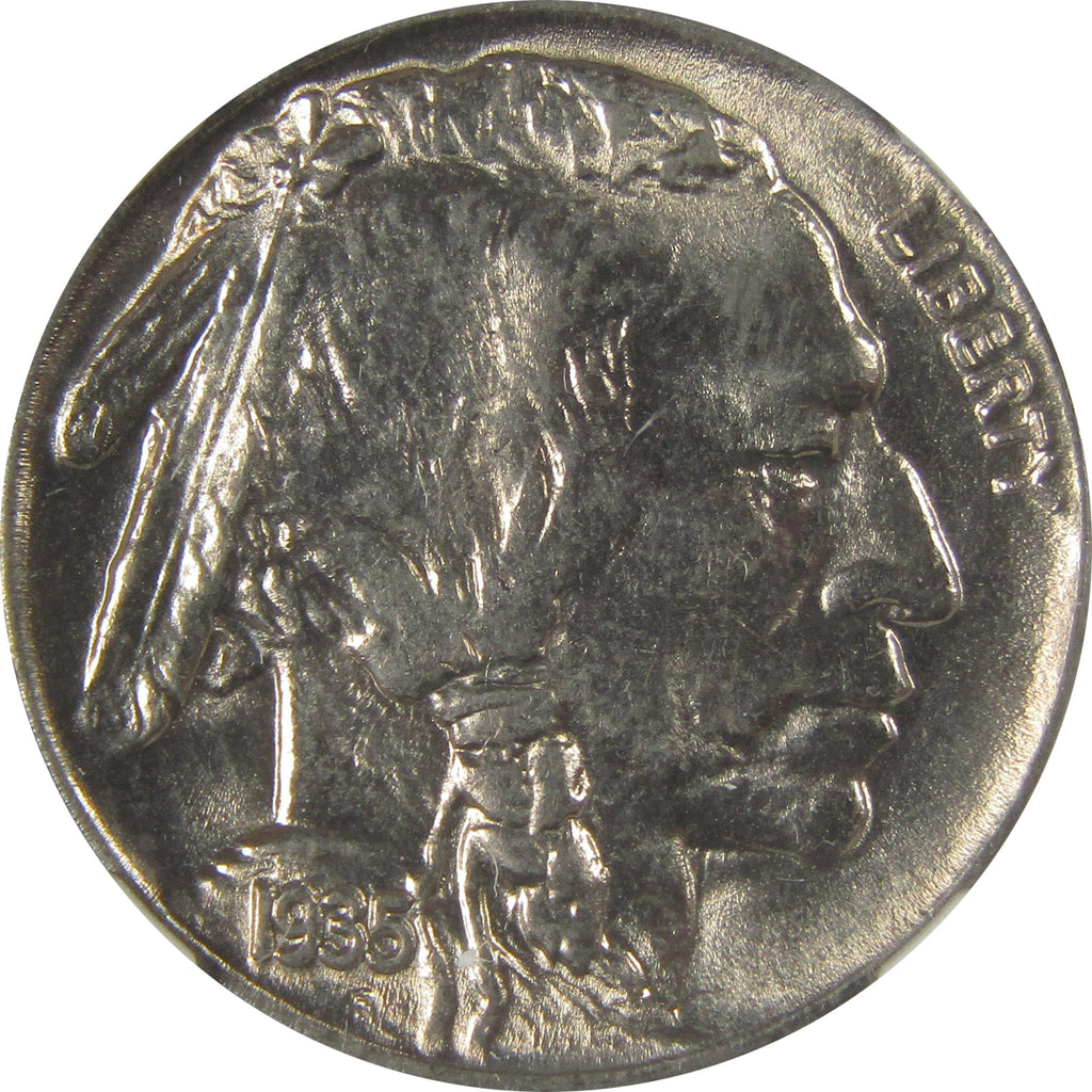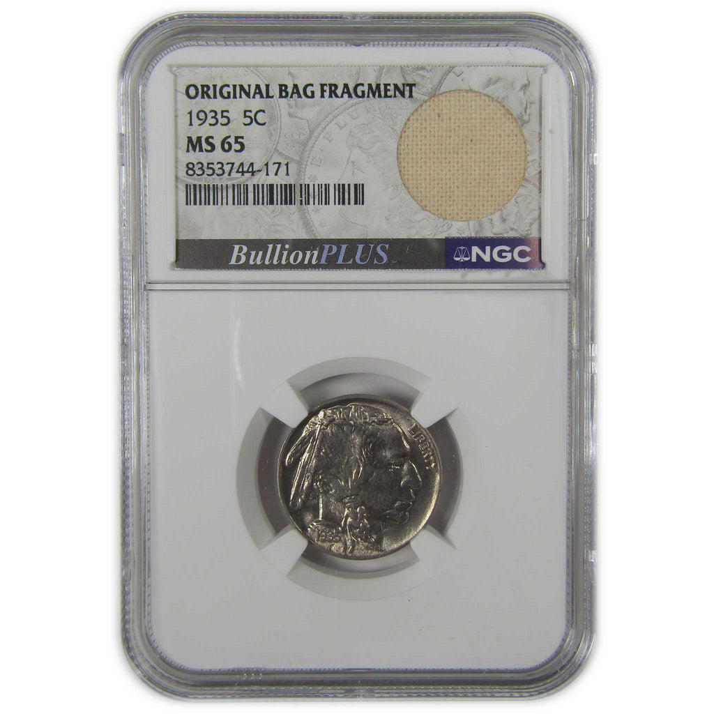 A genuine 1935 Indian Head Buffalo Nickel Coin, graded and certified MS 65 by NGC. Comes with a fragment of an original vintage canvas bag embedded in the label