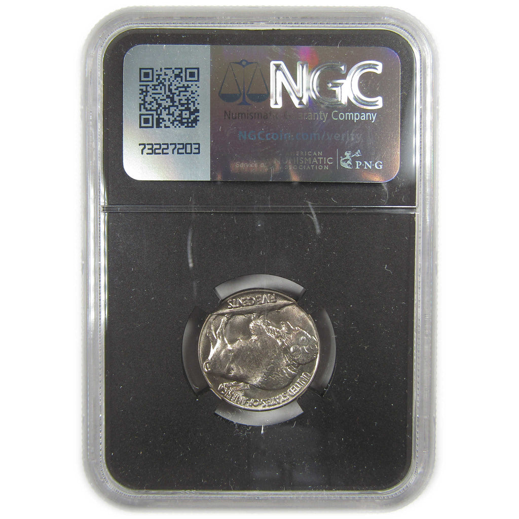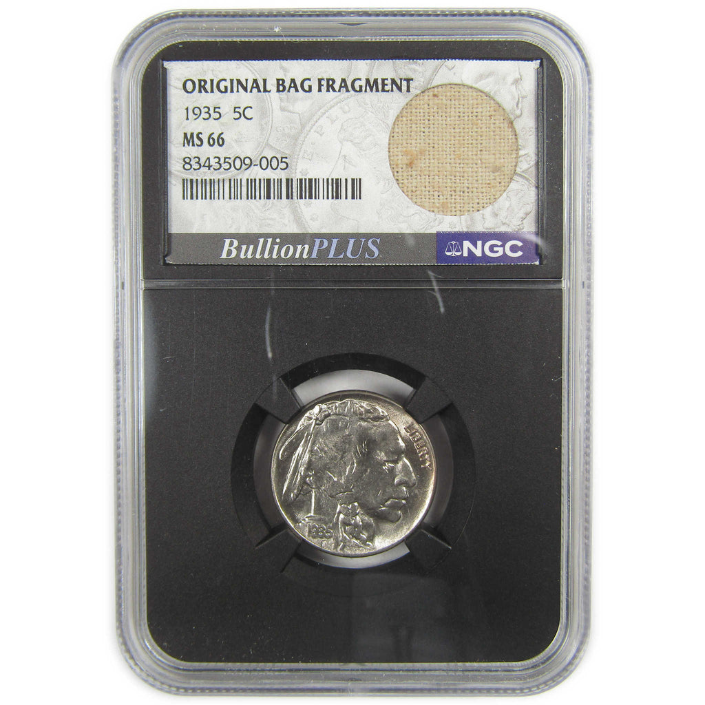 A genuine 1935 Indian Head Buffalo Nickel Coin, graded and certified MS 66 by NGC. Comes with a fragment of an original vintage canvas bag embedded in the label