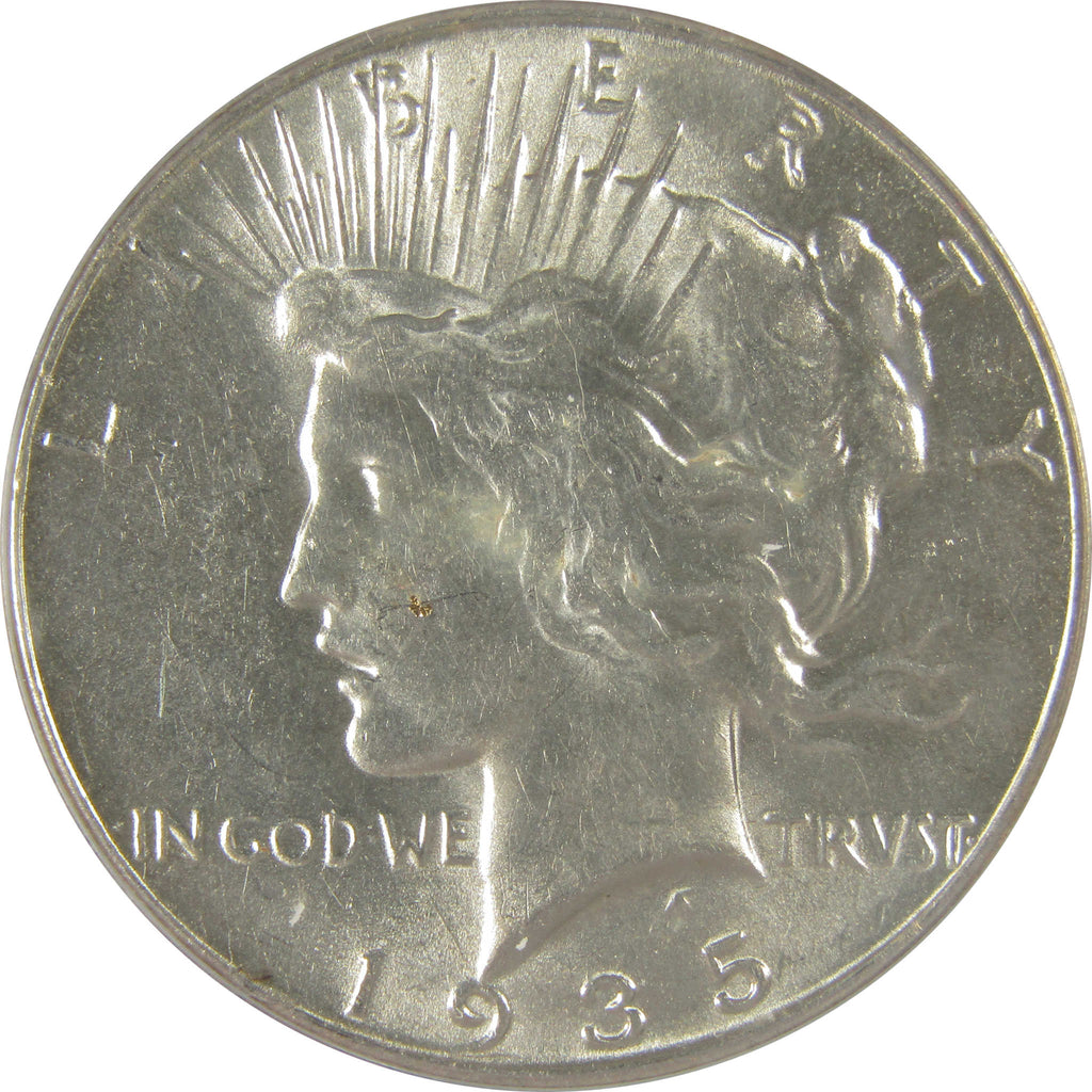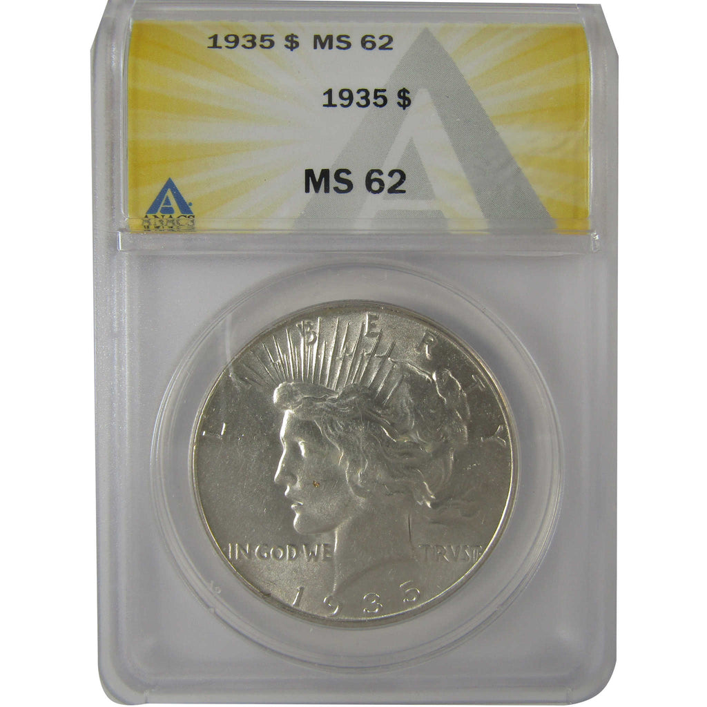 A genuine 1935 Peace Silver Dollar Coin, graded and certified MS 62 by ANACS. Contains 90% Silver