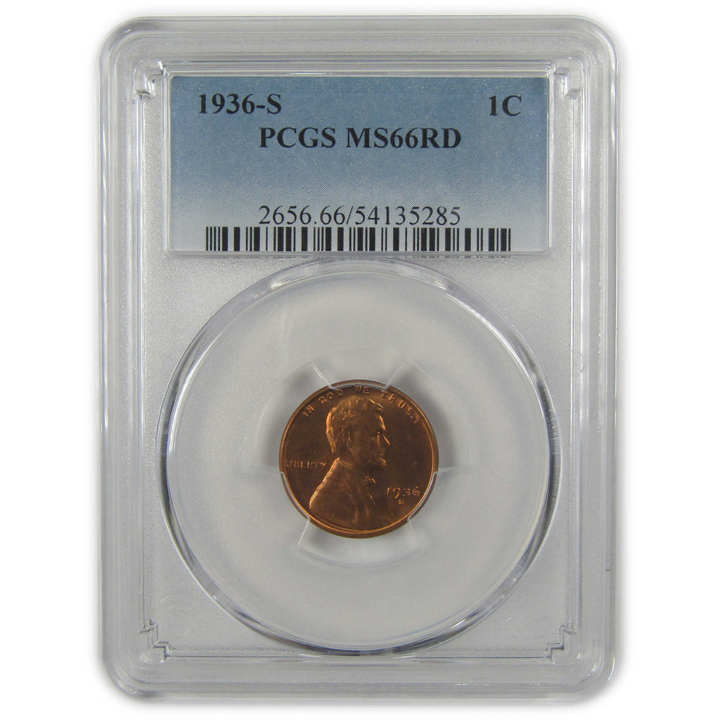 A genuine 1936 S Lincoln Wheat Cent Penny Coin, graded and certified MS 66 RD by PCGS