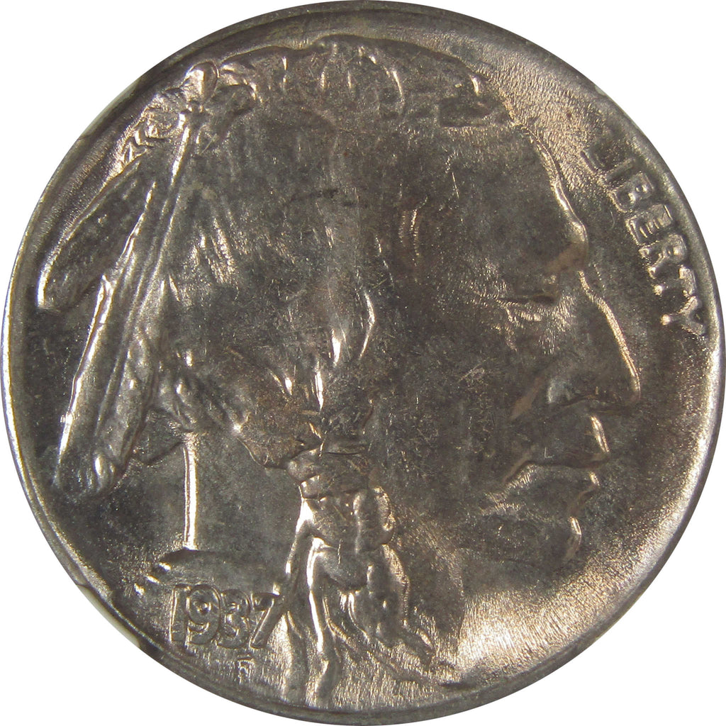 A genuine 1937 S Indian Head Buffalo Nickel Coin, graded and certified MS 66 by NGC. Comes with a fragment of an original vintage canvas bag embedded in the label