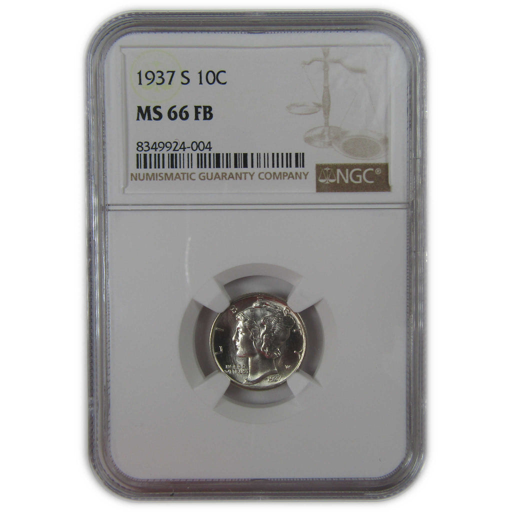 A genuine 1937 S Mercury Silver Dime Coin, graded and certified MS 66 FB by NGC. Contains 90% Silver