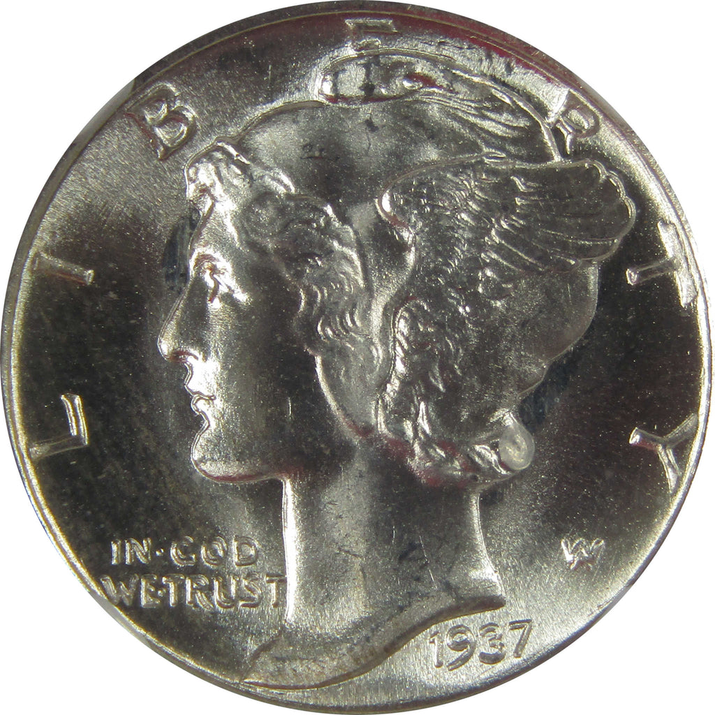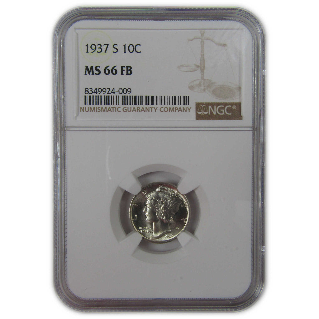 A genuine 1937 S Mercury Silver Dime Coin, graded and certified MS 66 FB by NGC. Contains 90% Silver