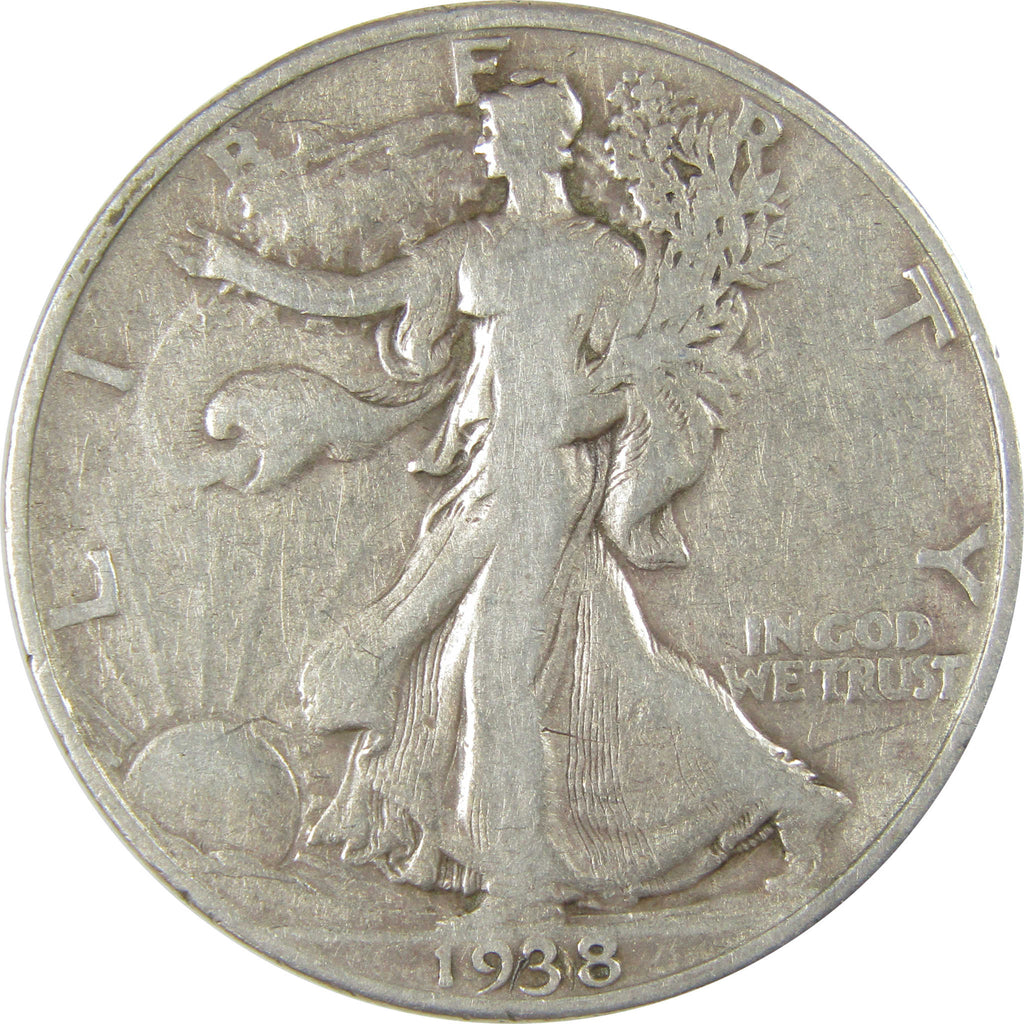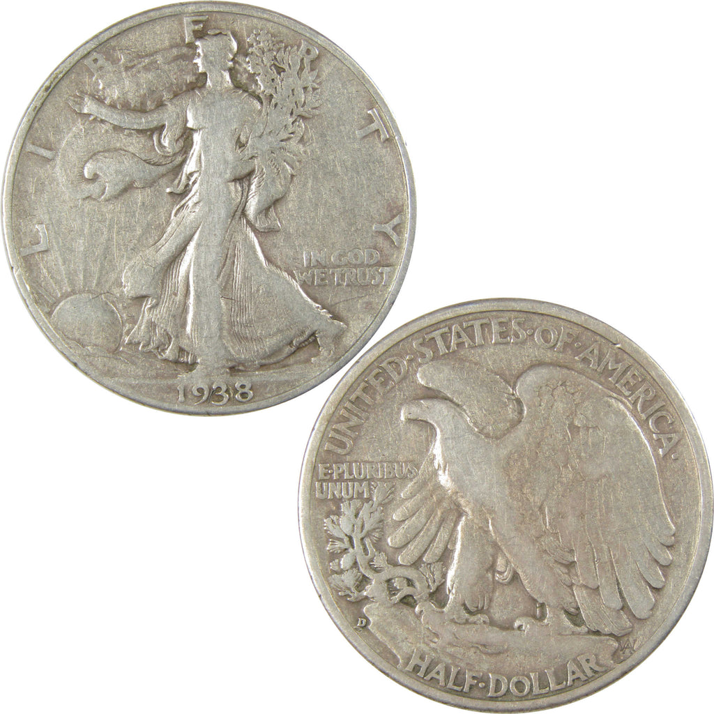 A genuine 1938 D Liberty Walking Silver Half Dollar Coin, in F Fine Condition. Contains 90% Silver