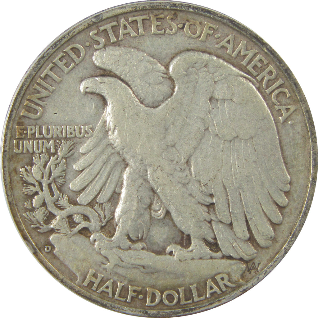 A genuine 1938 D Liberty Walking Silver Half Dollar Coin, graded and certified VF 35 by ANACS. Contains 90% Silver