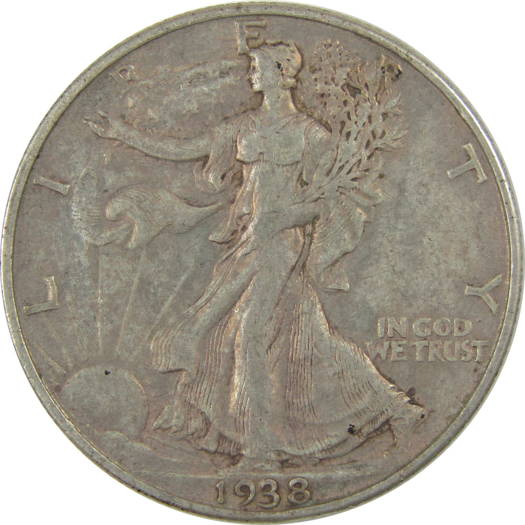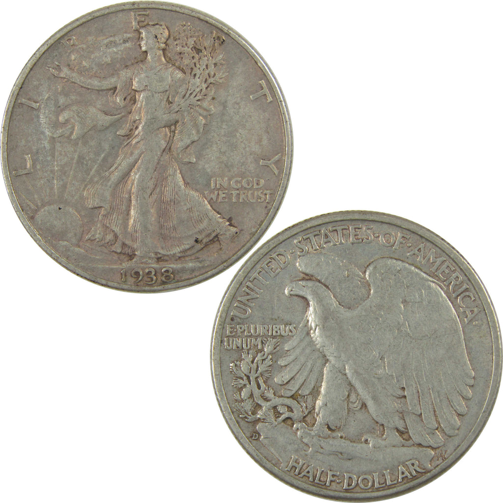 A genuine 1938 D Liberty Walking Silver Half Dollar Coin, in XF EF Extremely Fine Condition. Contains 90% Silver