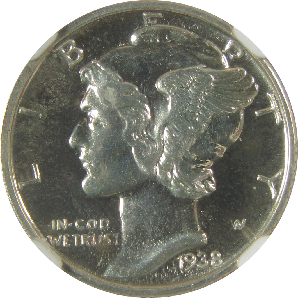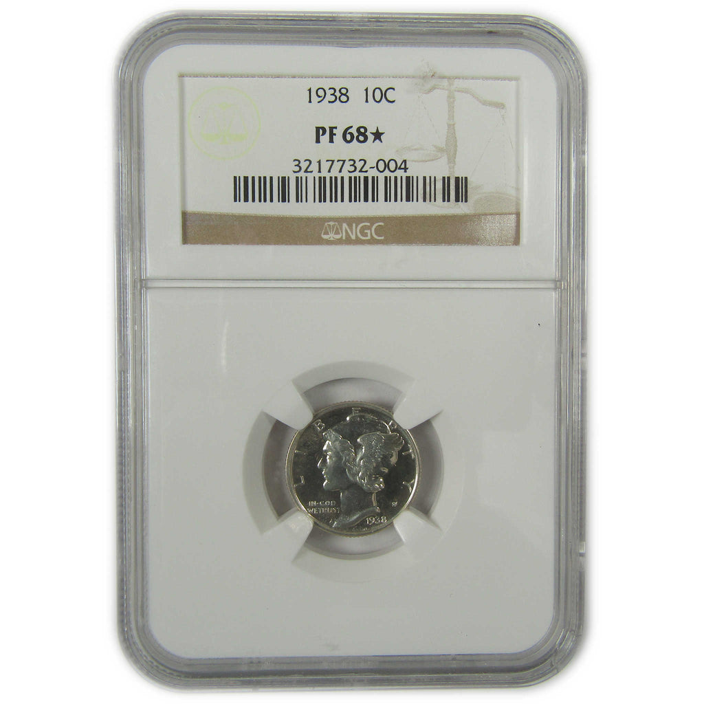 A genuine 1938 Mercury Silver Dime Proof Coin, graded and certified PF 68* by NGC. Contains 90% Silver