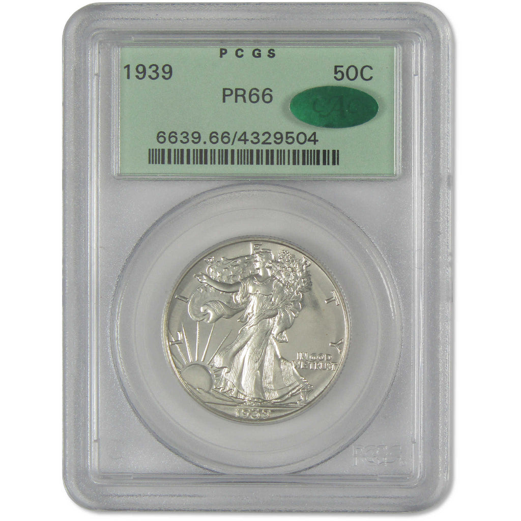 A genuine 1939 Liberty Walking Silver Half Dollar Proof Coin, graded and certified PR 66 by PCGS & CAC. Contains 90% Silver