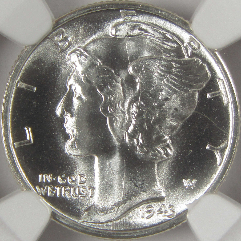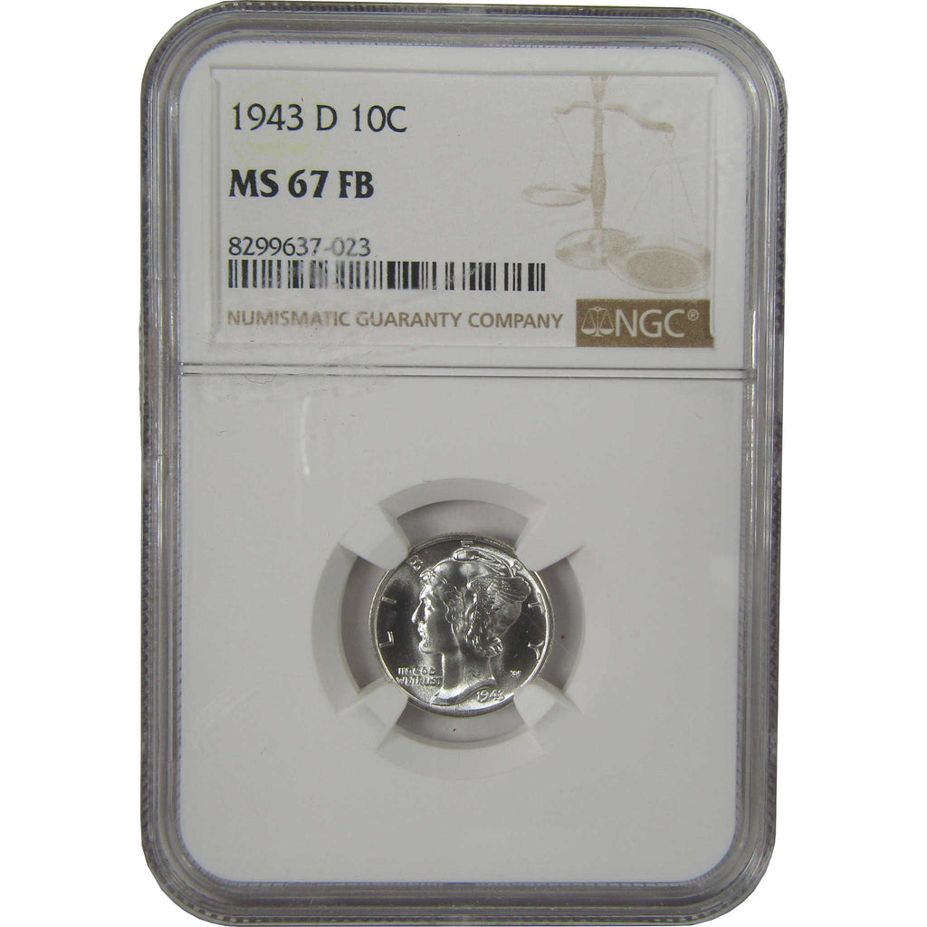 A genuine 1943 D Mercury Silver Dime Coin, graded and certified MS 67 FB by NGC. Contains 90% Silver