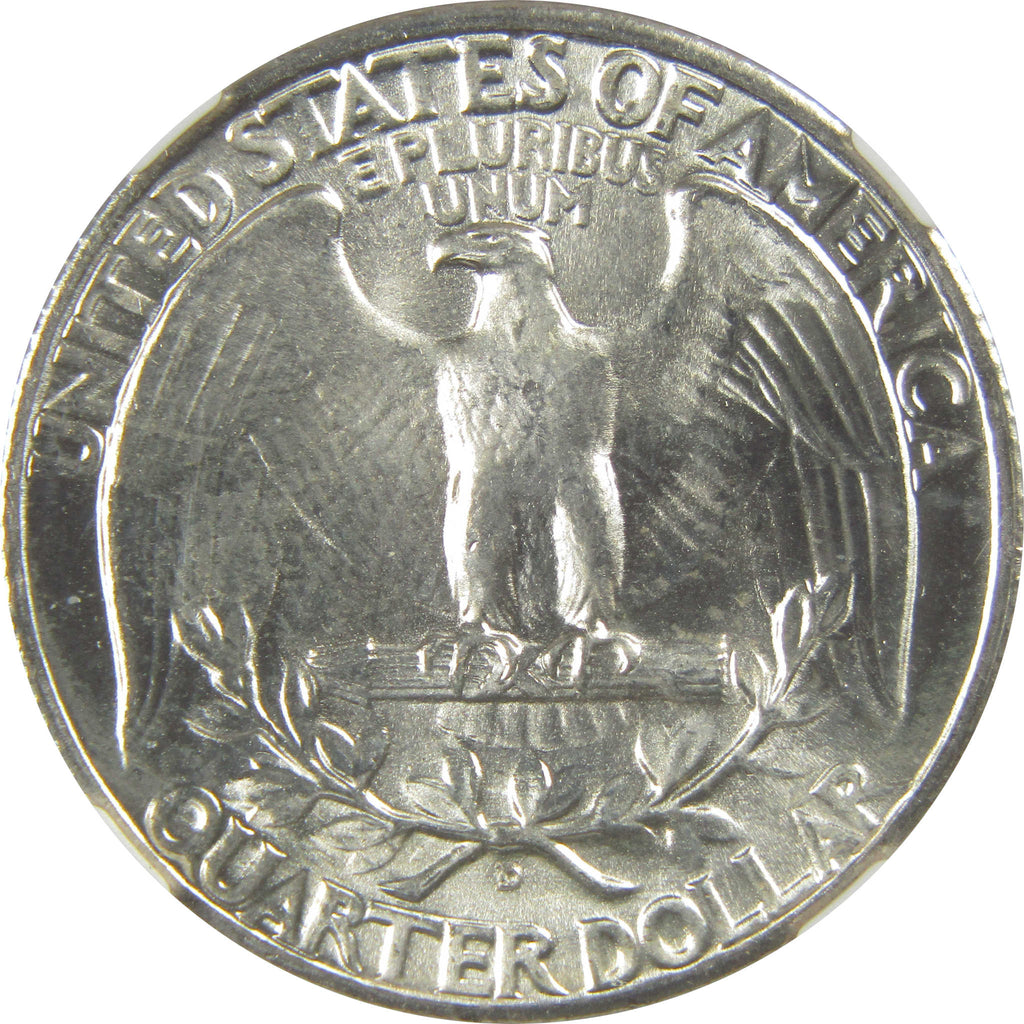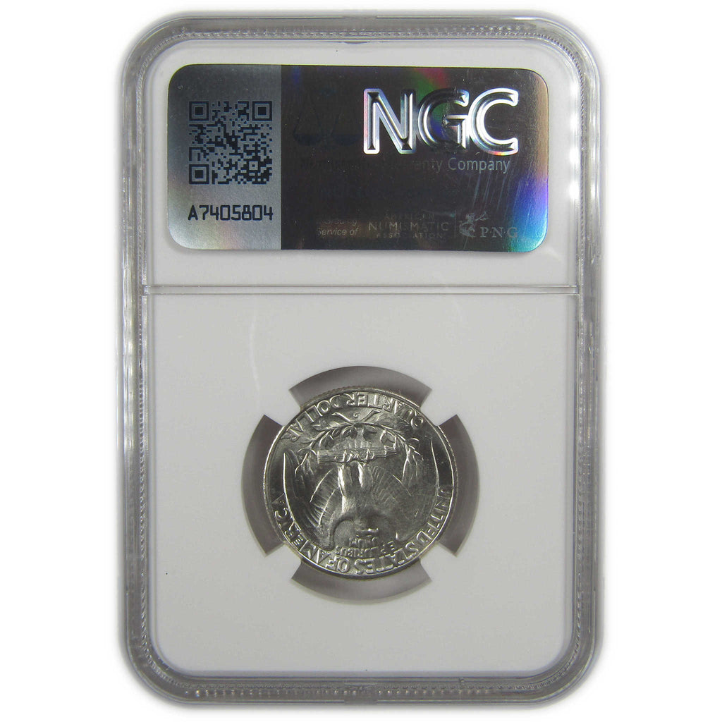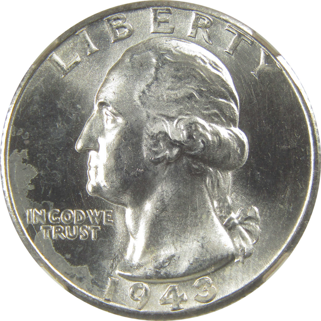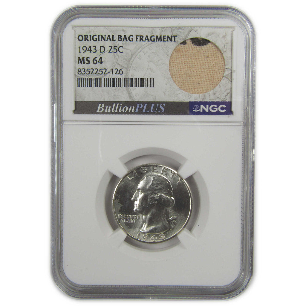 A genuine 1943 D Washington Silver Quarter Coin, graded and certified MS 64 by NGC. Contains 90% Silver. Comes with a fragment of an original vintage canvas bag embedded in the label