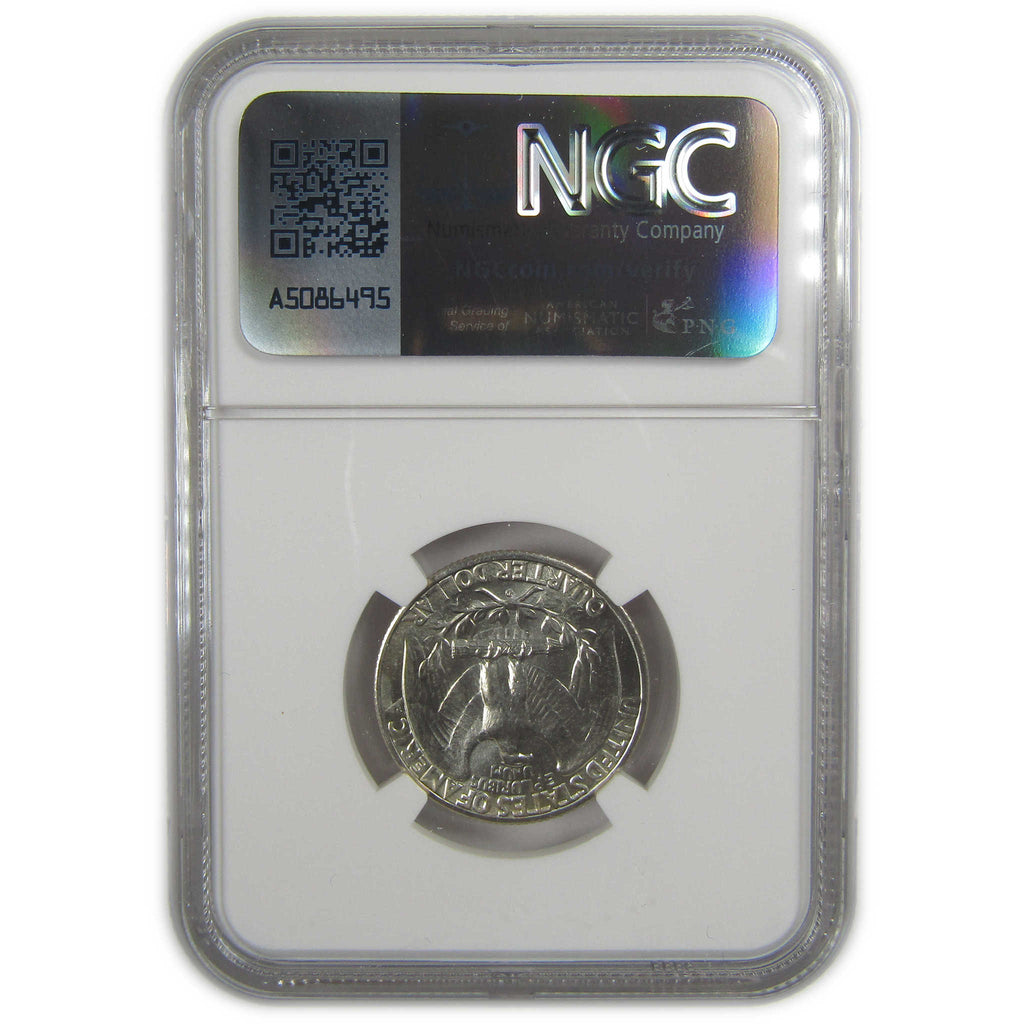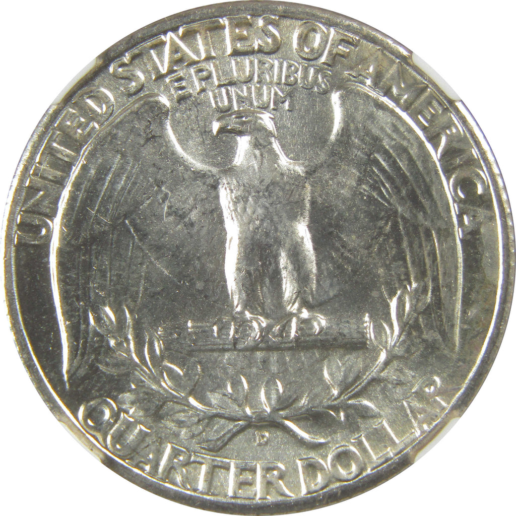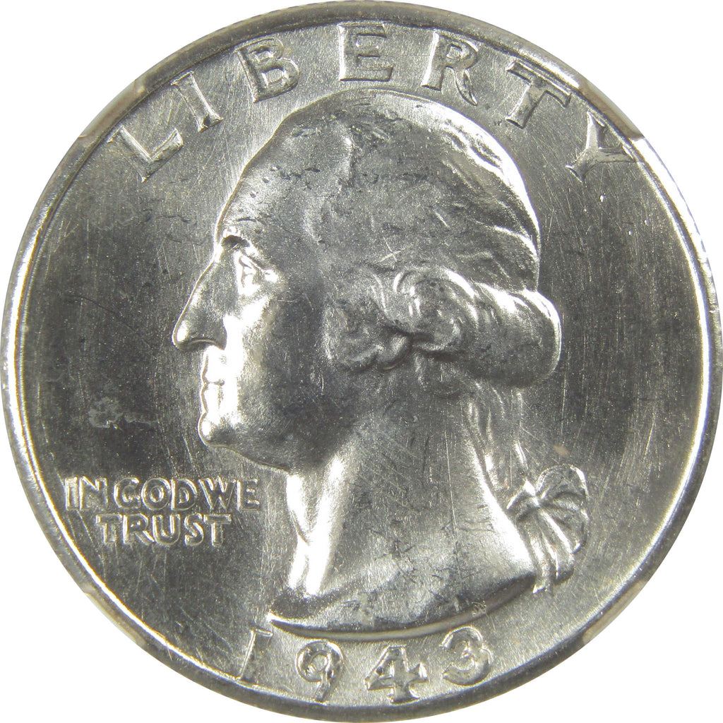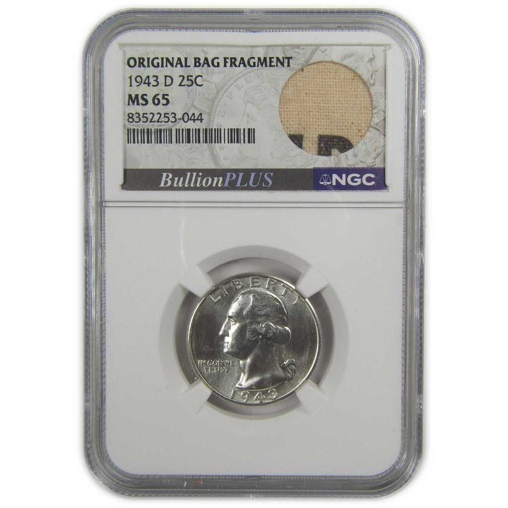 A genuine 1943 D Washington Silver Quarter Coin, graded and certified MS 65 by NGC. Contains 90% Silver. Comes with a fragment of an original vintage canvas bag embedded in the label