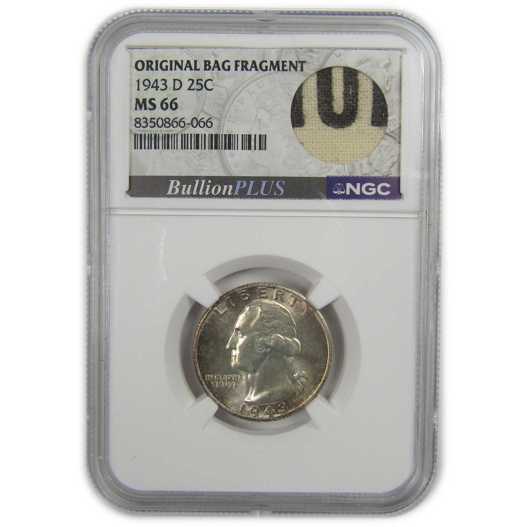 A genuine 1943 D Washington Silver Quarter Coin, graded and certified MS 66 by NGC. Contains 90% Silver. Comes with a fragment of an original vintage canvas bag embedded in the label
