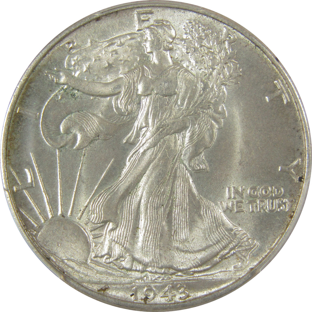 A genuine 1943 Liberty Walking Silver Half Dollar Coin, graded and certified MS 64 by PCGS. Contains 90% Silver