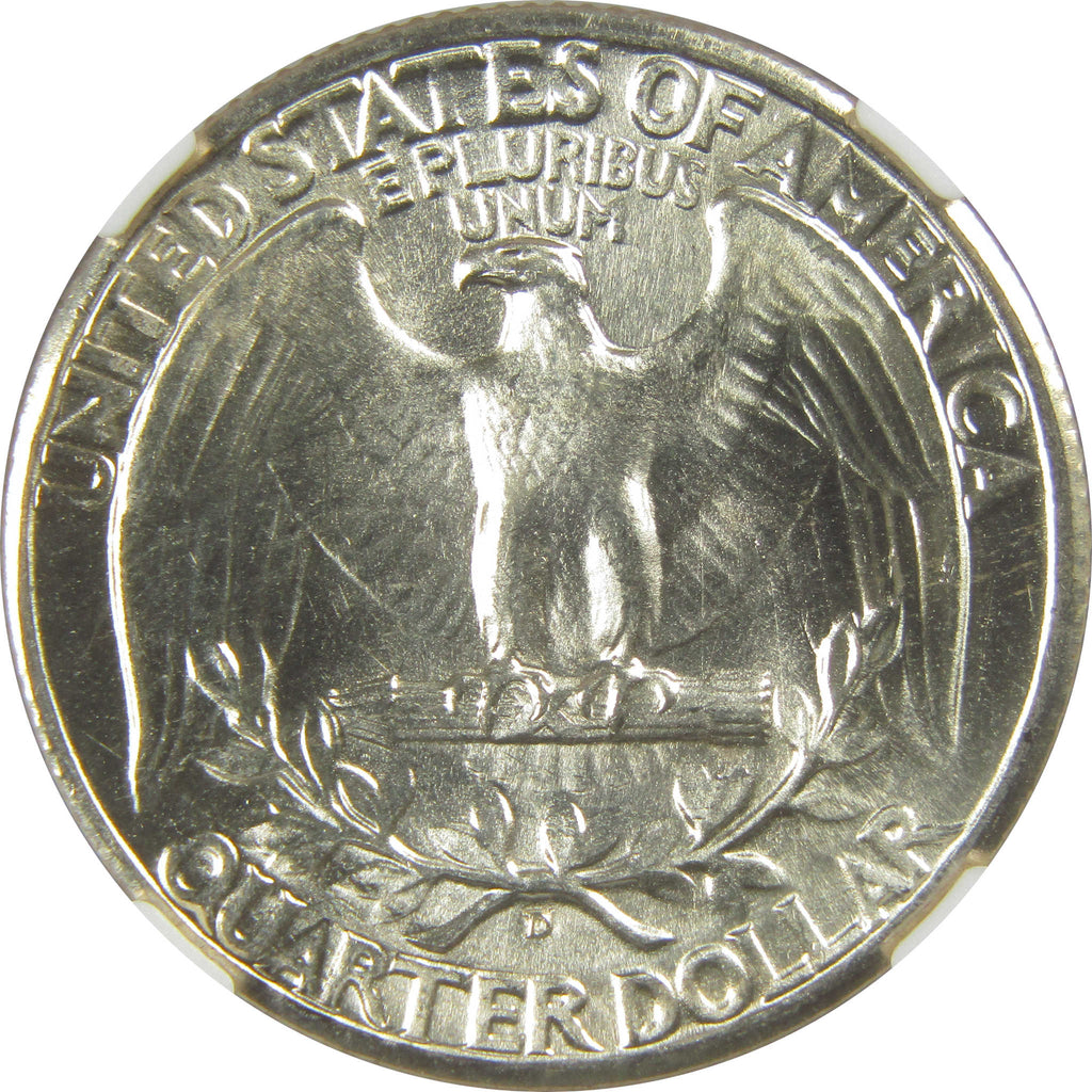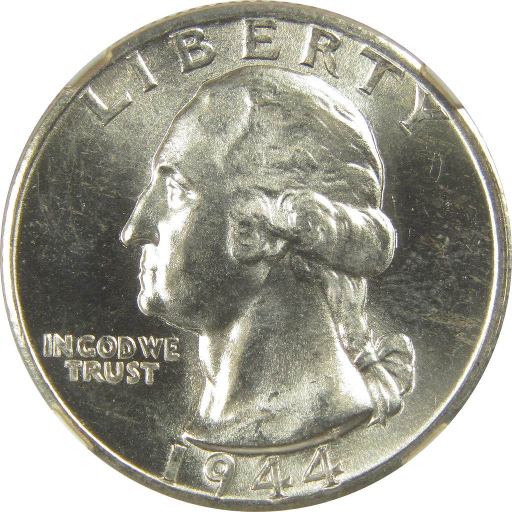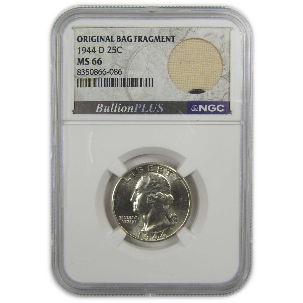 A genuine 1944 D Washington Silver Quarter Coin, graded and certified MS 66 by NGC. Contains 90% Silver. Comes with a fragment of an original vintage canvas bag embedded in the label