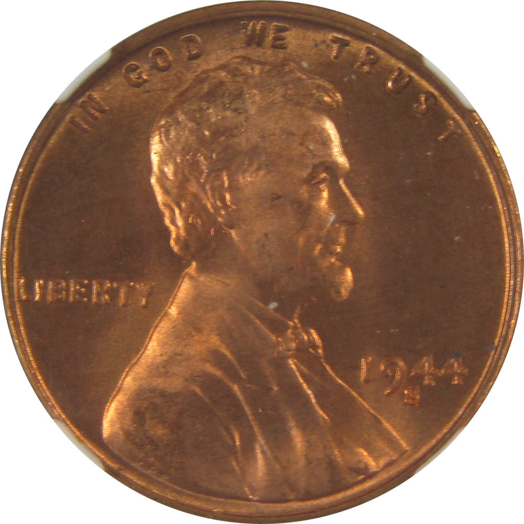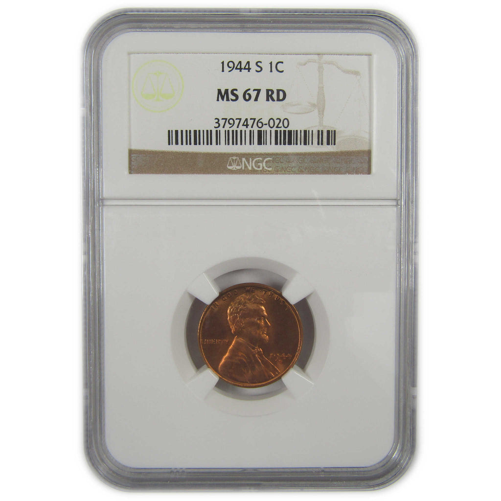A genuine 1944 S Lincoln Wheat Cent Penny Coin, graded and certified MS 67 RD by NGC