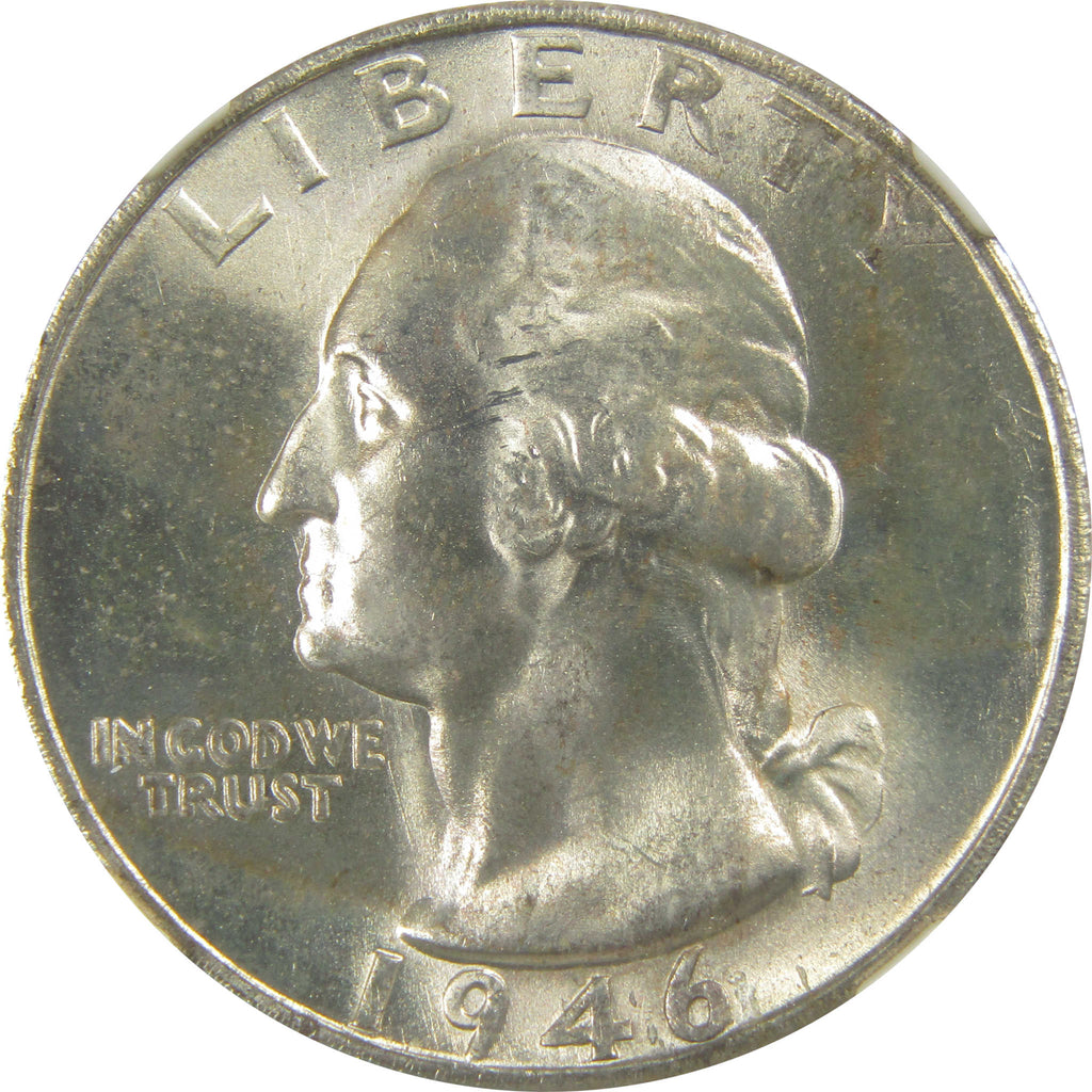 A genuine 1946 S Washington Silver Quarter Coin, graded and certified MS 66 by NGC. Contains 90% Silver. Comes with a fragment of an original vintage canvas bag embedded in the label