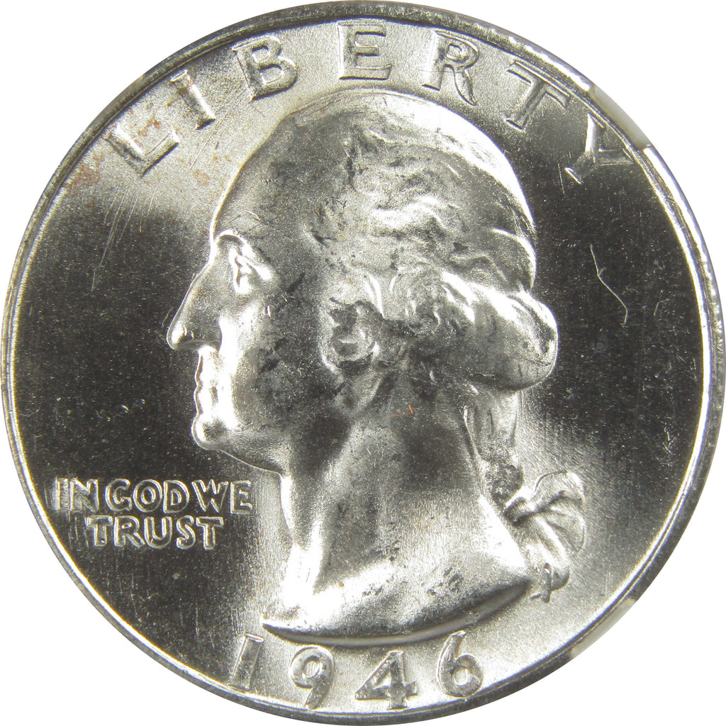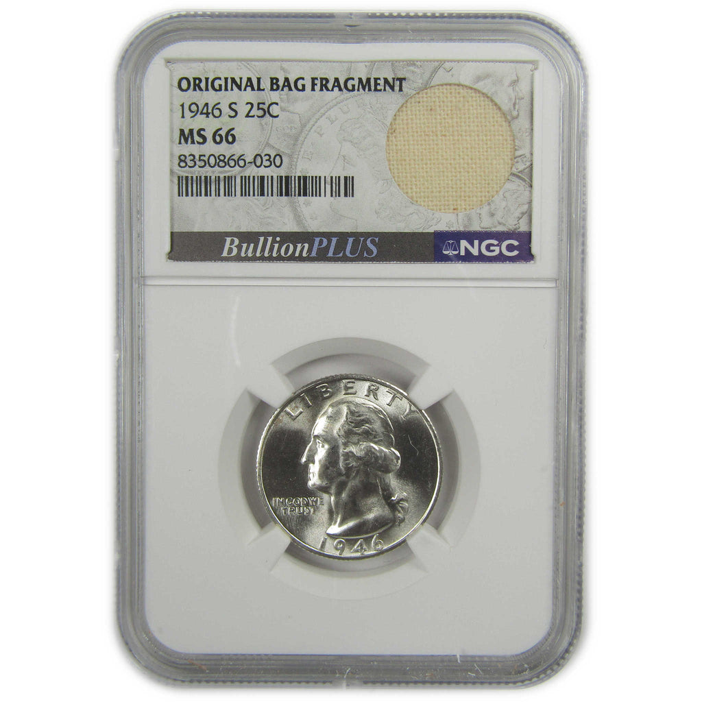 A genuine 1946 S Washington Silver Quarter Coin, graded and certified MS 66 by NGC. Contains 90% Silver. Comes with a fragment of an original vintage canvas bag embedded in the label