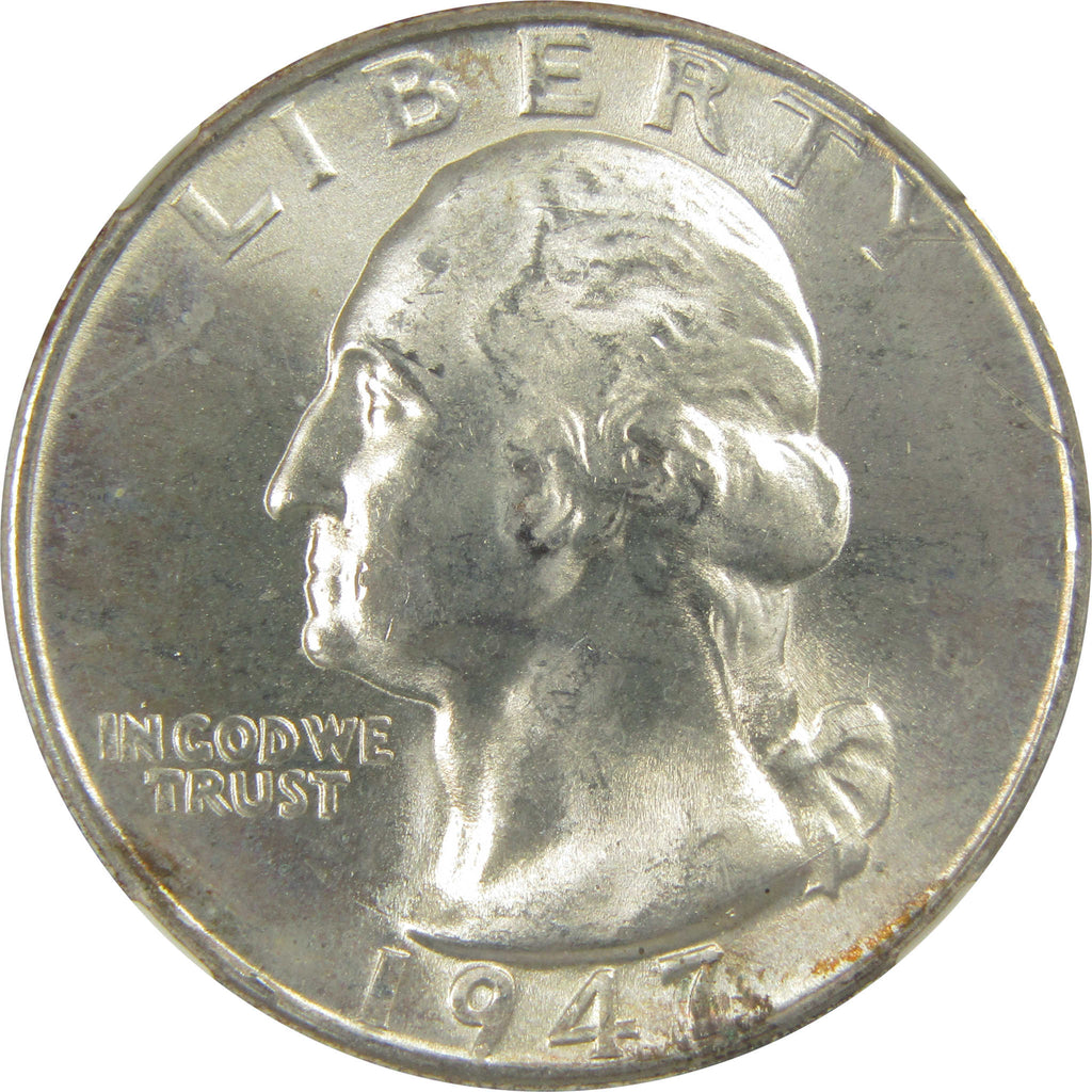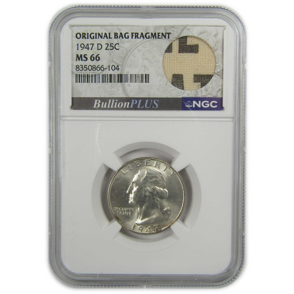 A genuine 1947 D Washington Silver Quarter Coin, graded and certified MS 66 by NGC. Contains 90% Silver. Comes with a fragment of an original vintage canvas bag embedded in the label