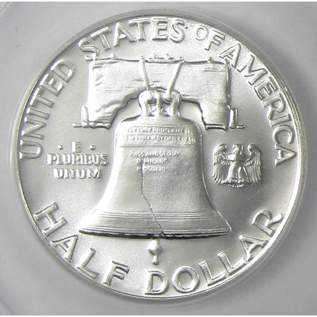 This Franklin half dollar is from America's last circulating half dollar series struck entirely in 90% silver. Its obverse bears John R. Sinnock's portrait of Benjamin Franklin, while the reverse depicts the Liberty Bell and a small eagle.