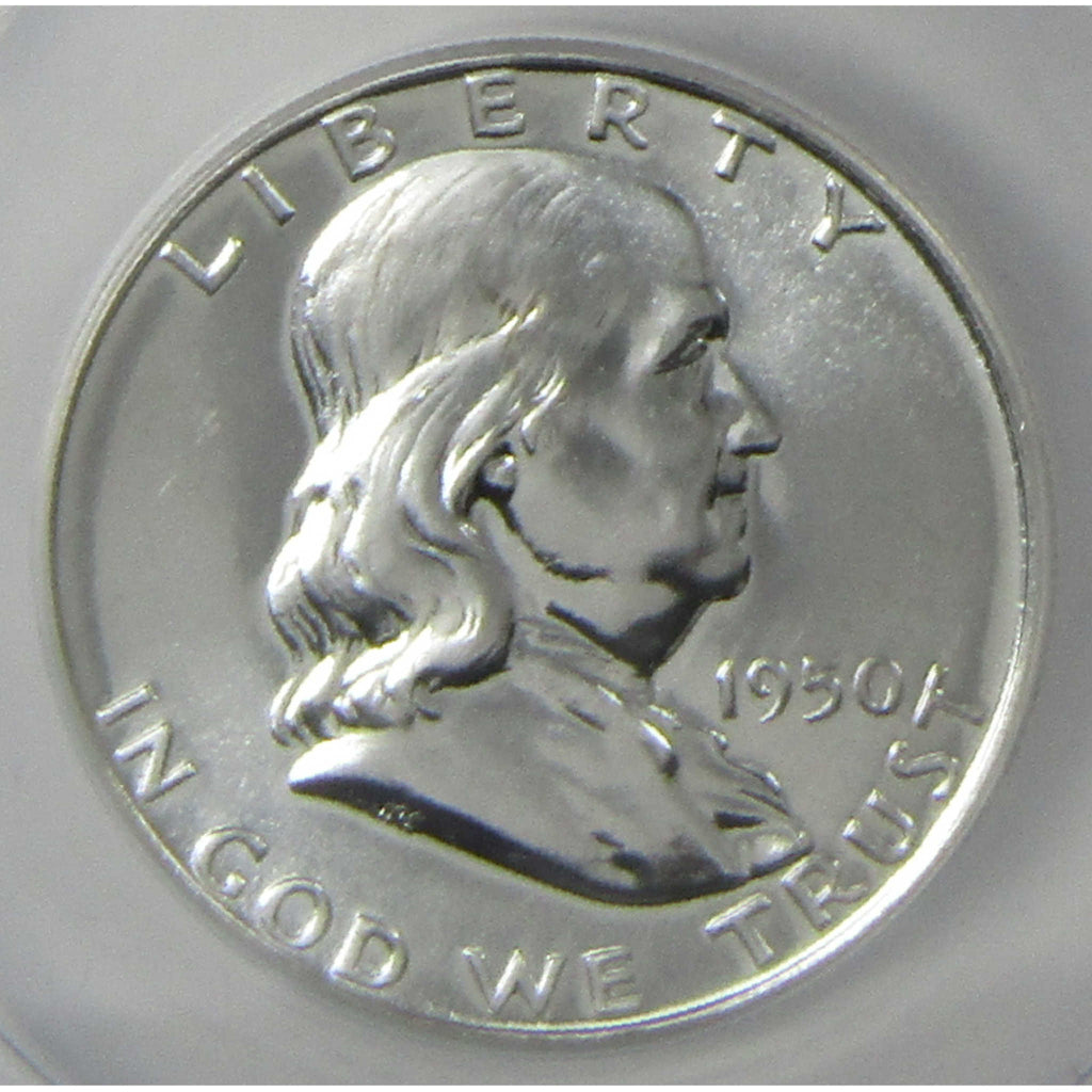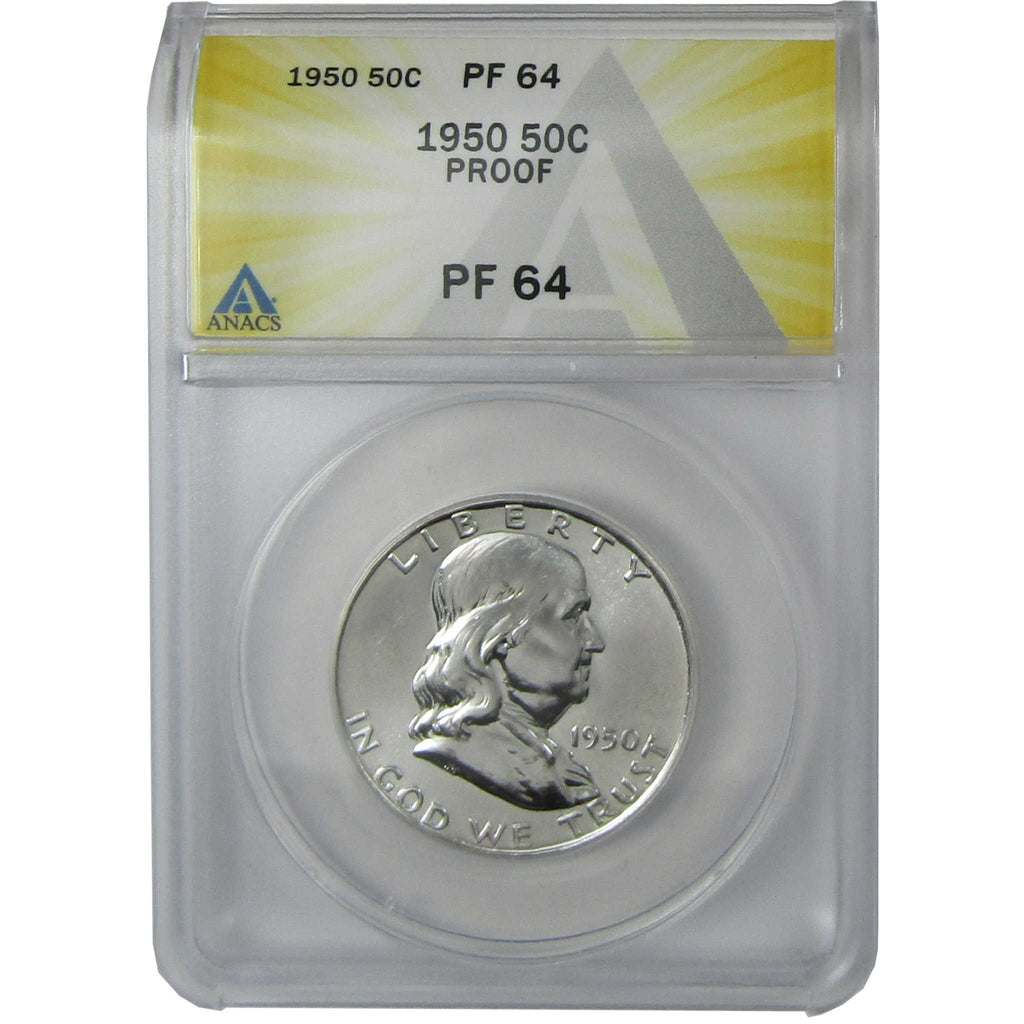 A genuine 1950 Franklin Silver Half Dollar Proof Coin, graded and certified PF 64 by ANACS. Contains 90% Silver