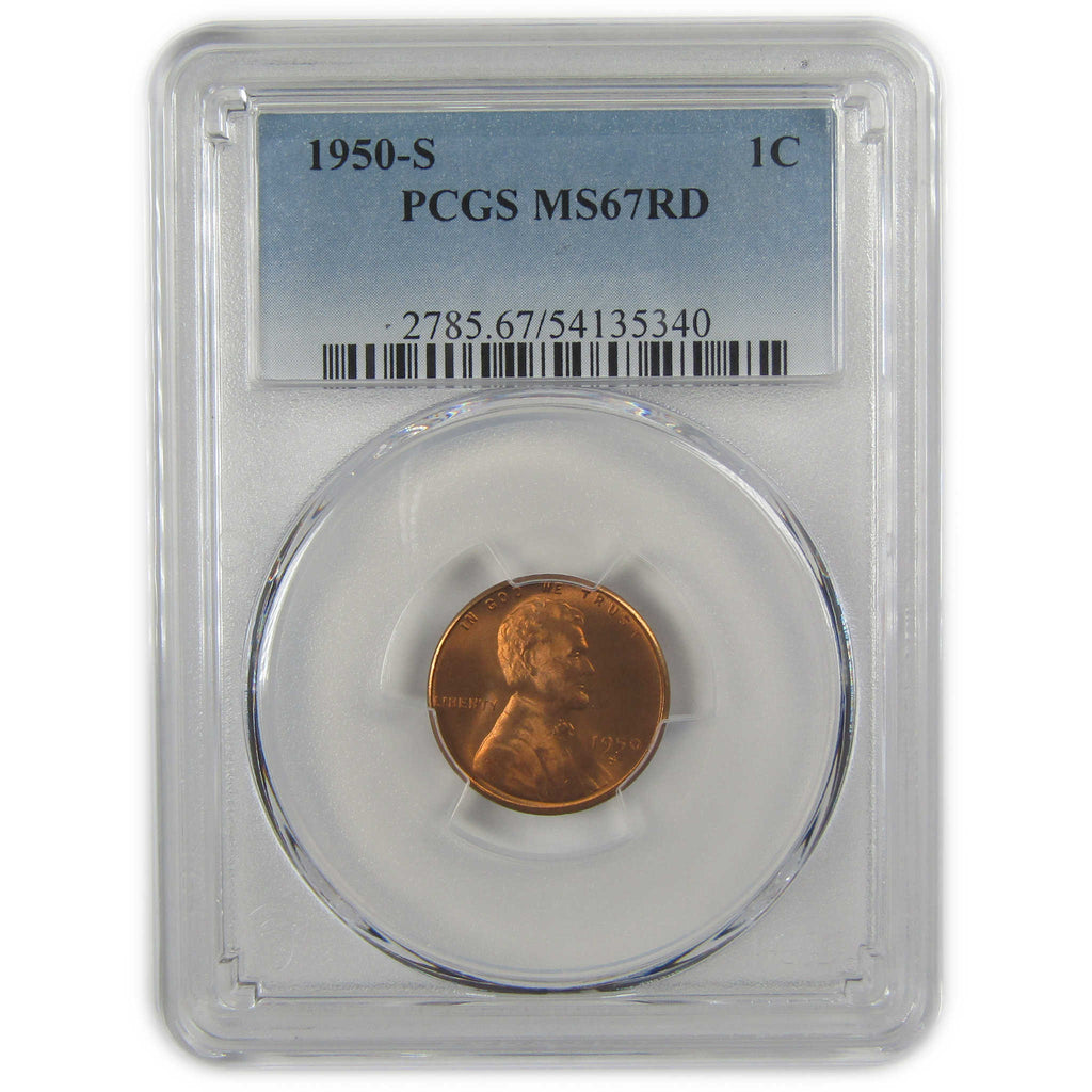 A genuine 1950 S Lincoln Wheat Cent Penny Coin, graded and certified MS 67 RD by PCGS