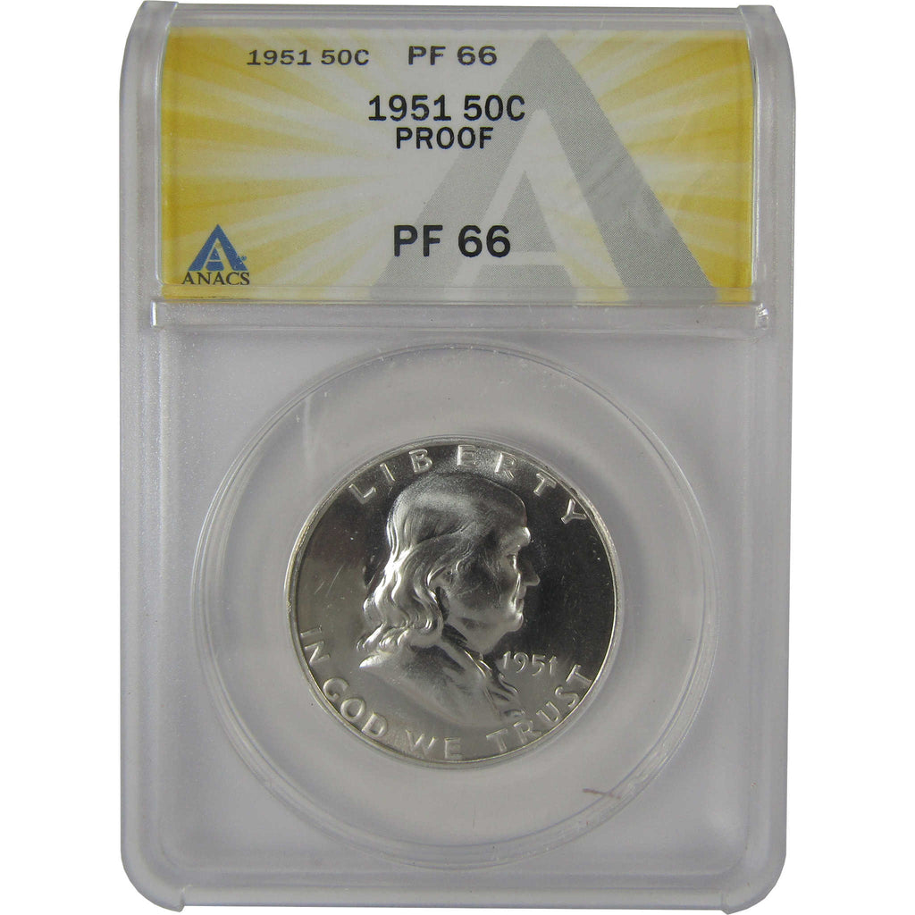 A genuine 1951 Franklin Silver Half Dollar Proof Coin, graded and certified PF 66 by ANACS. Contains 90% Silver