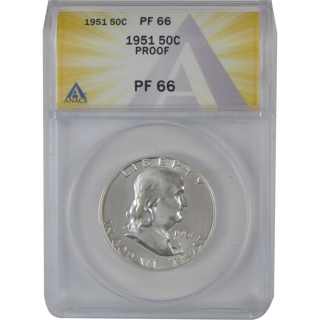 A genuine 1951 Franklin Silver Half Dollar Proof Coin, graded and certified PF 66 by ANACS. Contains 90% Silver