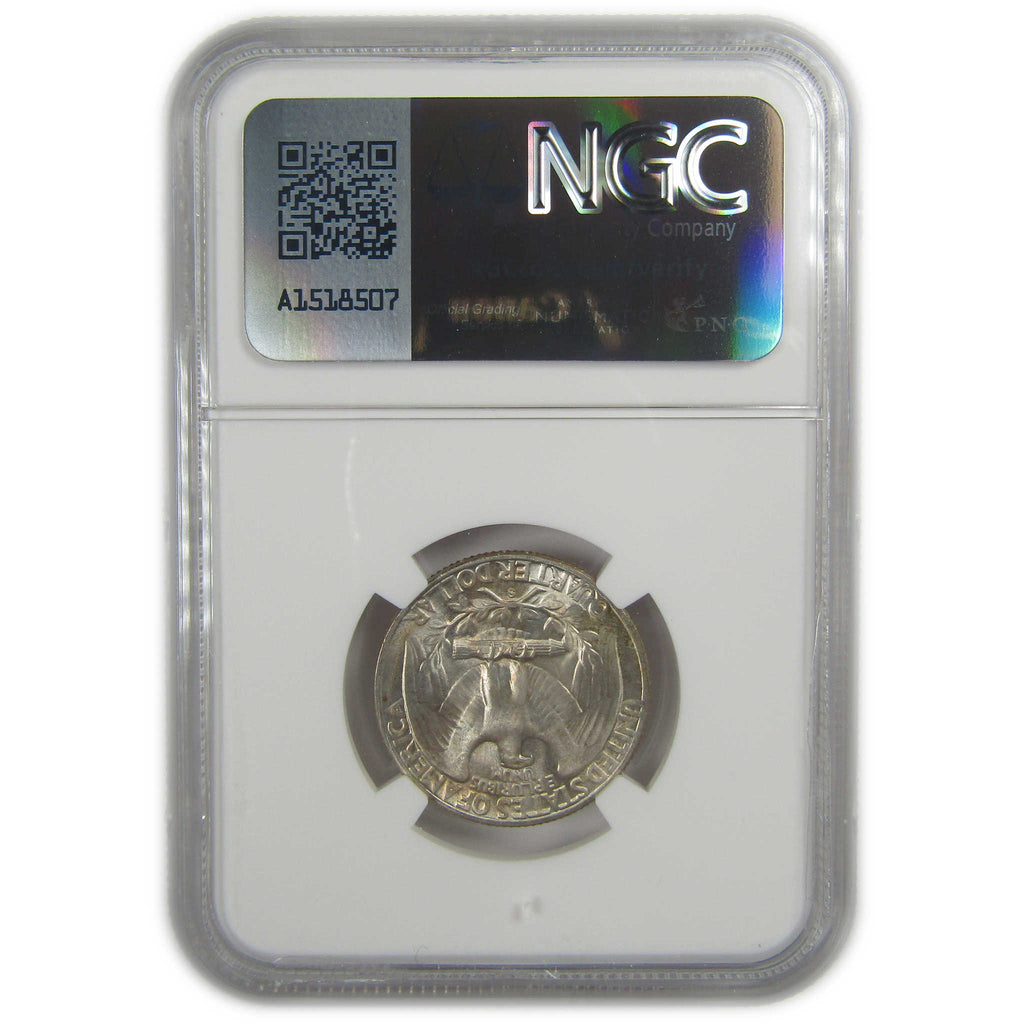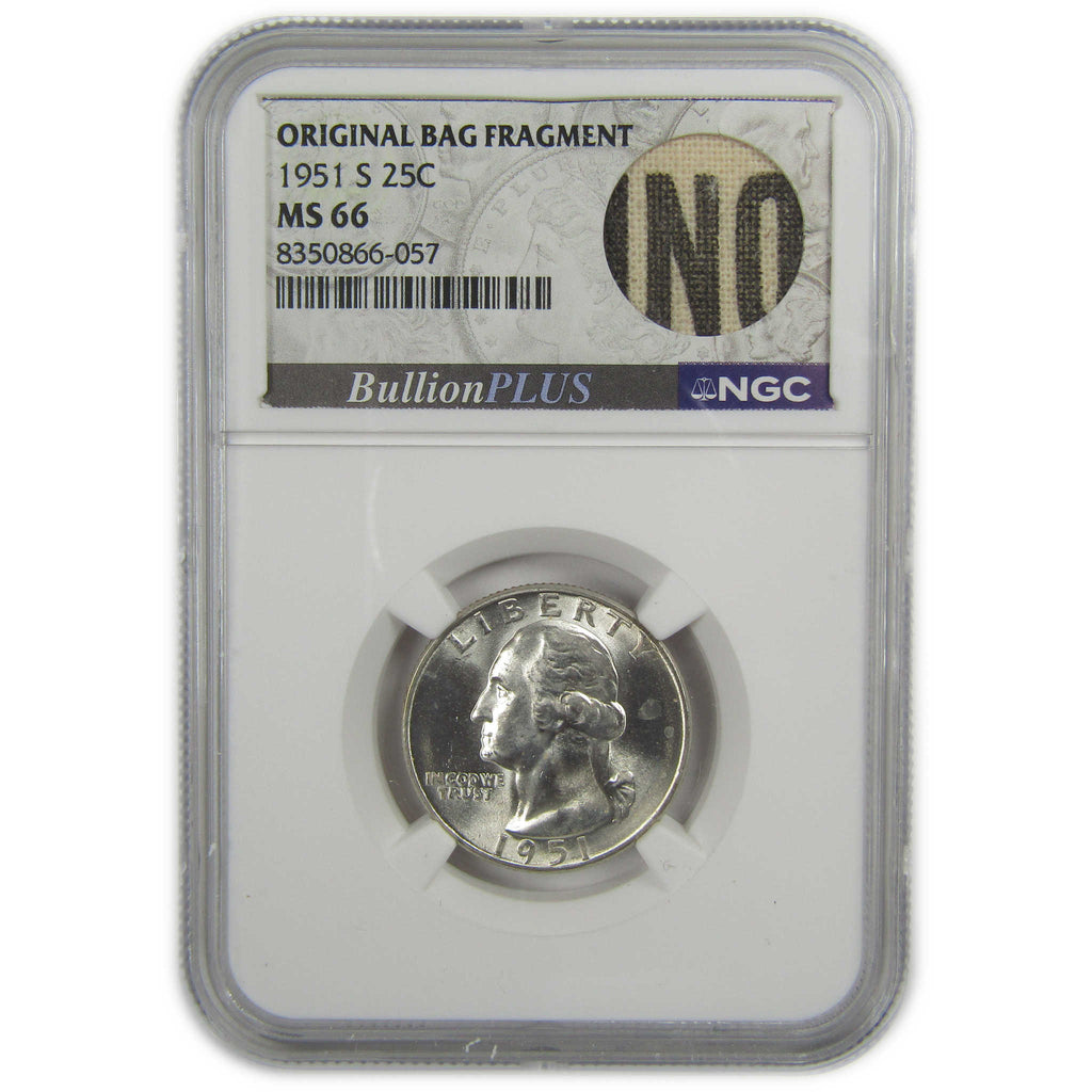 A genuine 1951 S Washington Silver Quarter Coin, graded and certified MS 66 by NGC. Contains 90% Silver. Comes with a fragment of an original vintage canvas bag embedded in the label