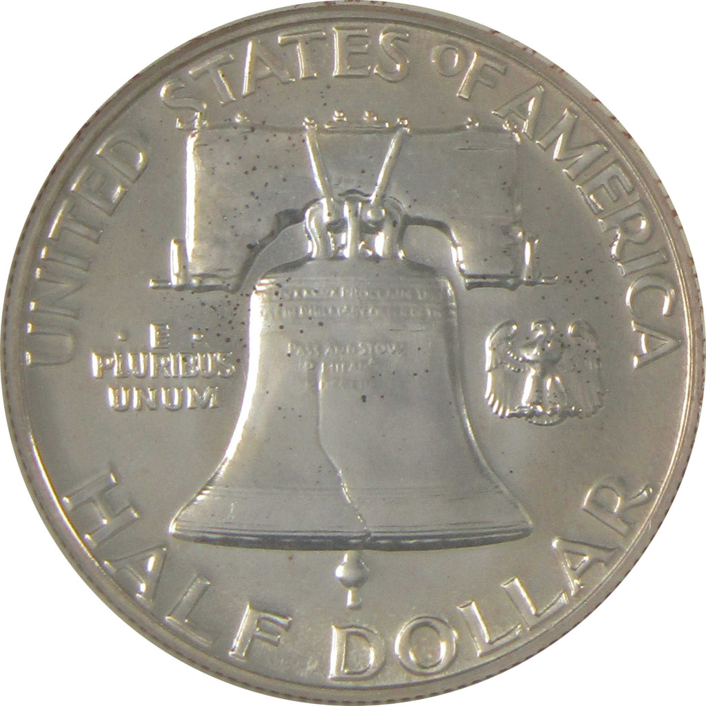 This Franklin half dollar is from America's last circulating half dollar series struck entirely in 90% silver. Its obverse bears John R. Sinnock's portrait of Benjamin Franklin, while the reverse depicts the Liberty Bell and a small eagle.