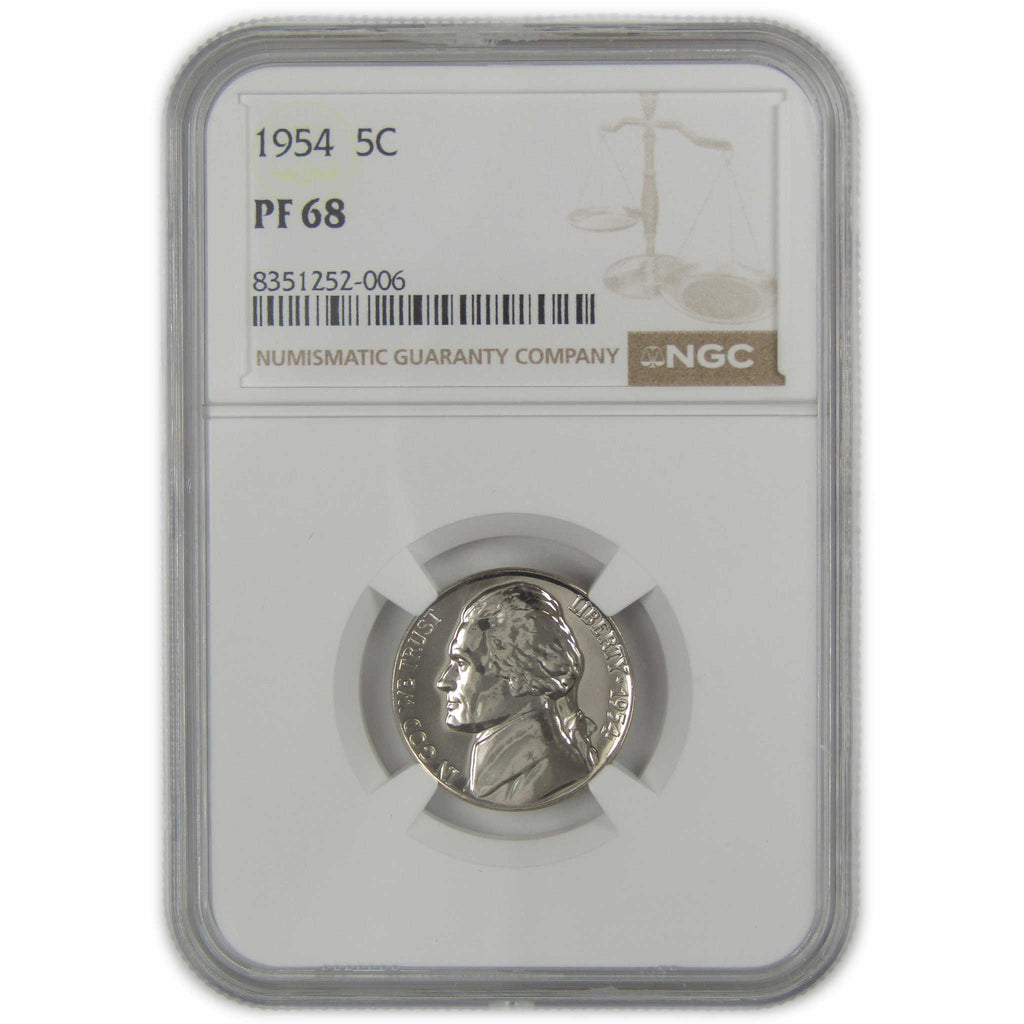 A genuine 1954 Jefferson Nickel Proof Coin, graded and certified PF 68 by NGC
