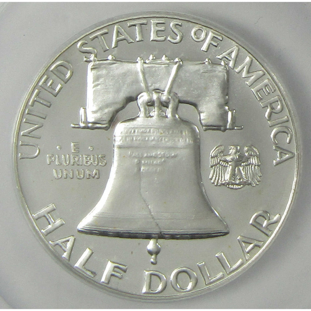 This Franklin half dollar is from America's last circulating half dollar series struck entirely in 90% silver. Its obverse bears John R. Sinnock's portrait of Benjamin Franklin, while the reverse depicts the Liberty Bell and a small eagle.