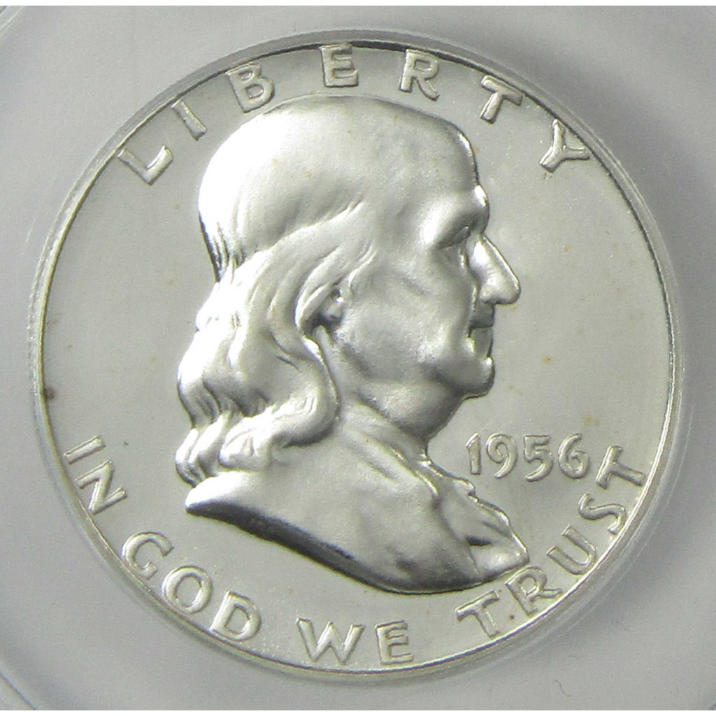A genuine 1956 Type 2 Franklin Silver Half Dollar Proof Coin, graded and certified PF 66 by ANACS. Contains 90% Silver