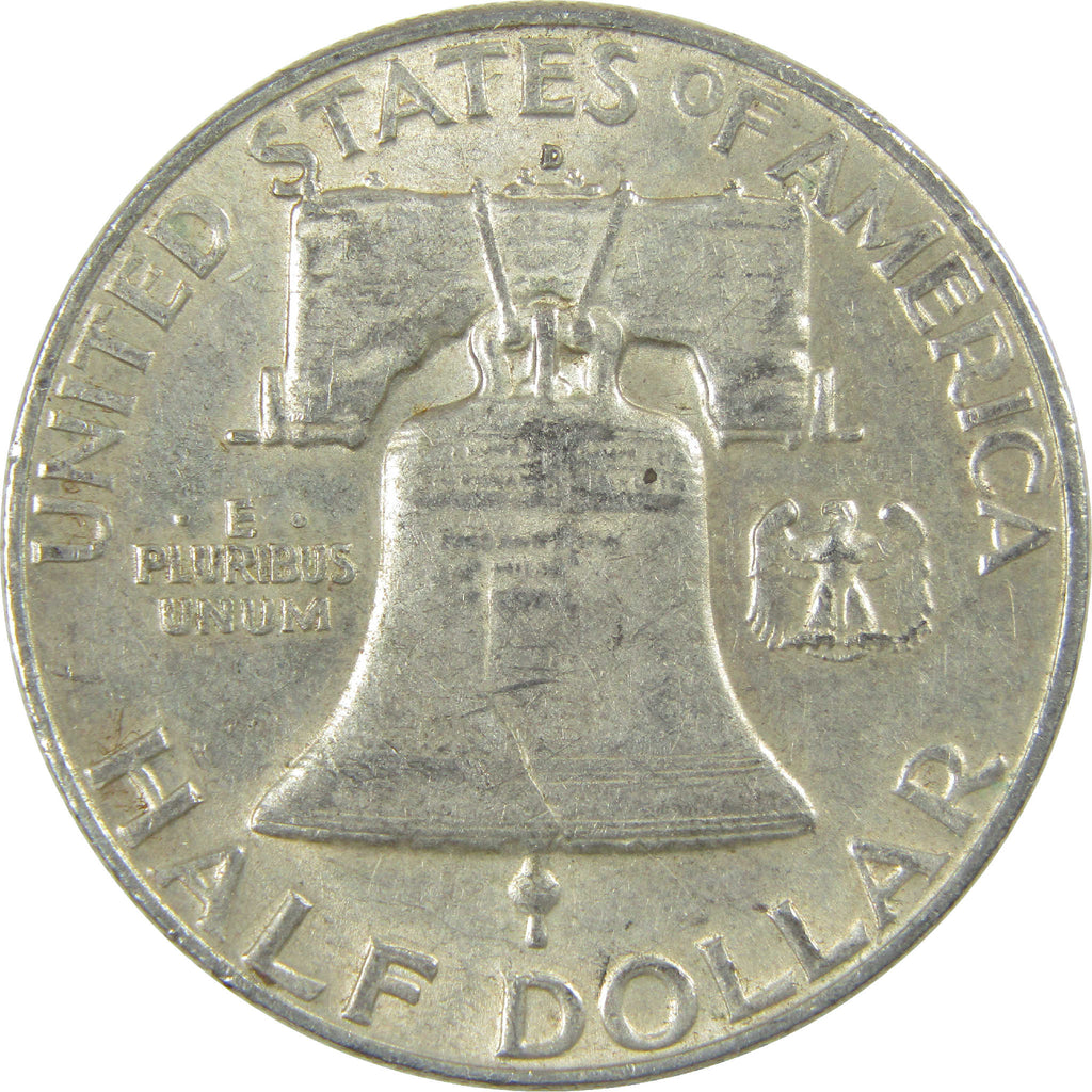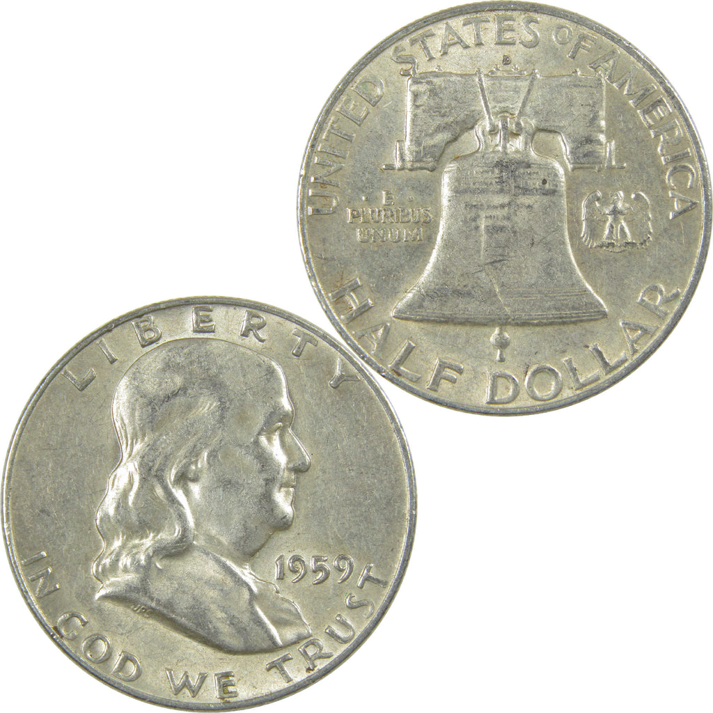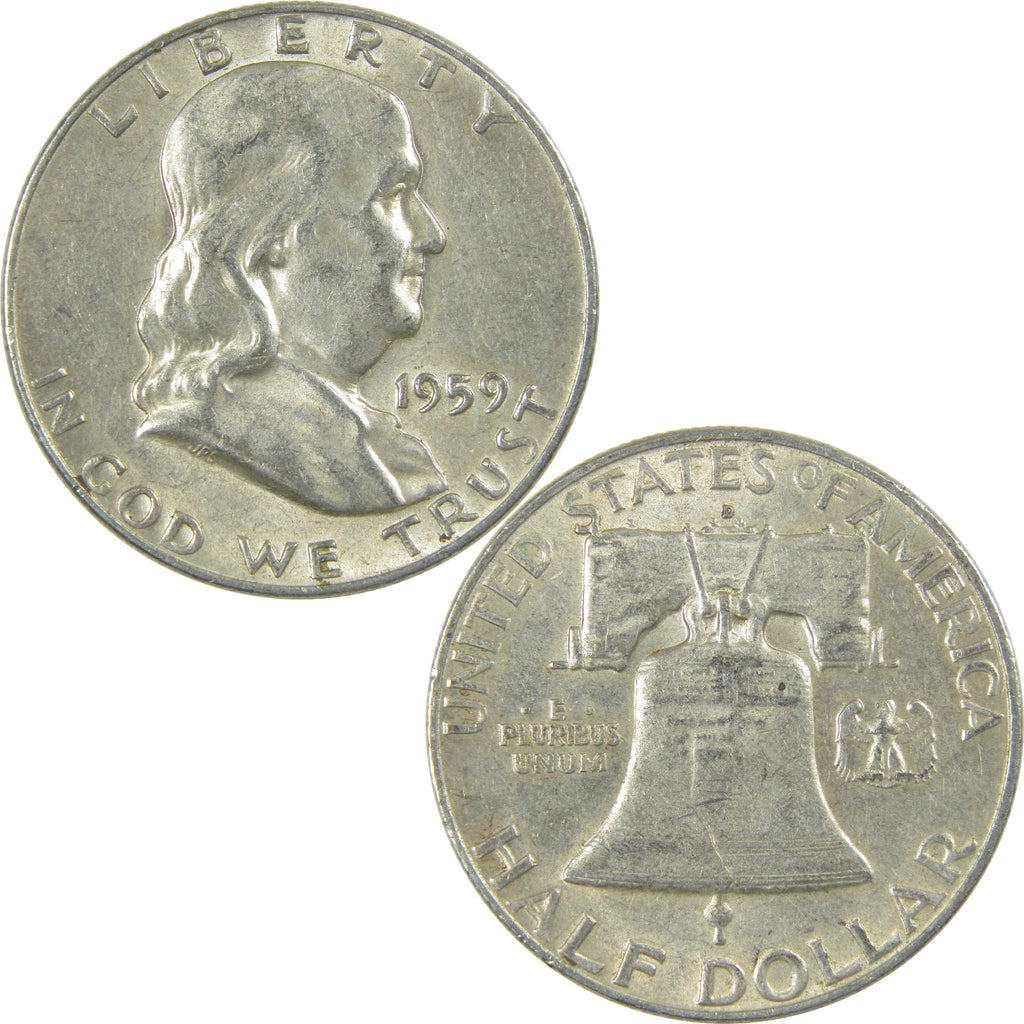 A genuine 1959 D Franklin Silver Half Dollar Coin, in AU About Uncirculated Condition. Contains 90% Silver