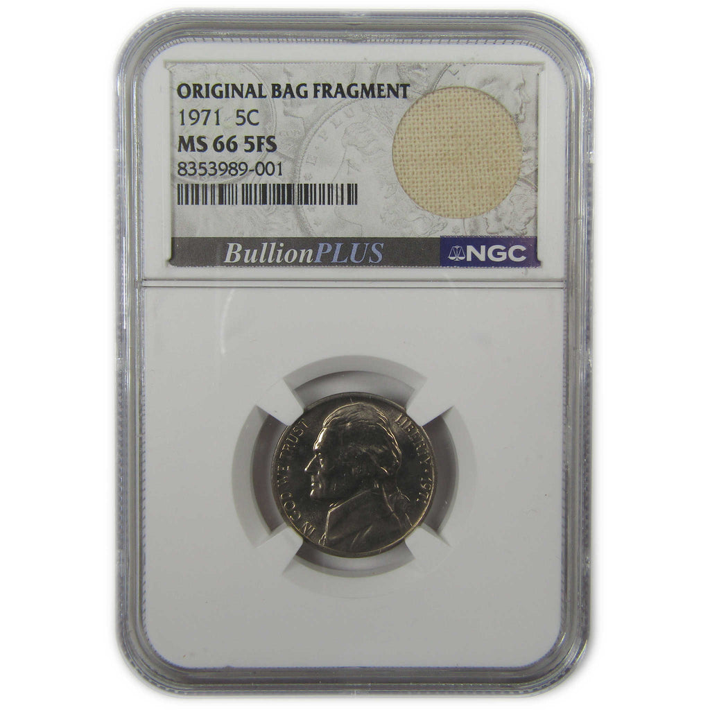 A genuine 1971 Jefferson Nickel Coin, graded and certified MS 66 5FS by NGC. Comes with a fragment of an original vintage canvas bag embedded in the label