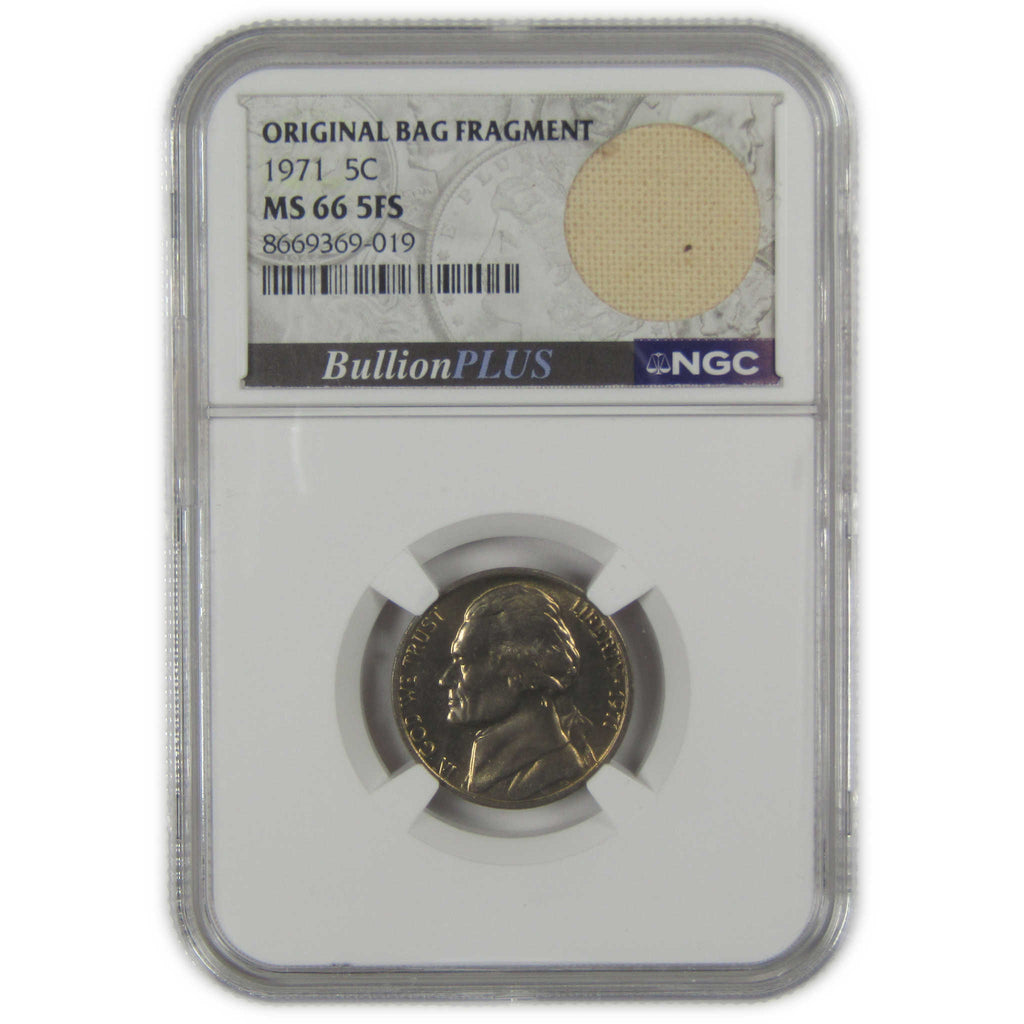 A genuine 1971 Jefferson Nickel Coin, graded and certified MS 66 5FS by NGC. Comes with a fragment of an original vintage canvas bag embedded in the label