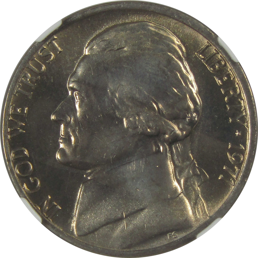 A genuine 1971 Jefferson Nickel Coin, graded and certified MS 66 by NGC. Comes with a fragment of an original vintage canvas bag embedded in the label