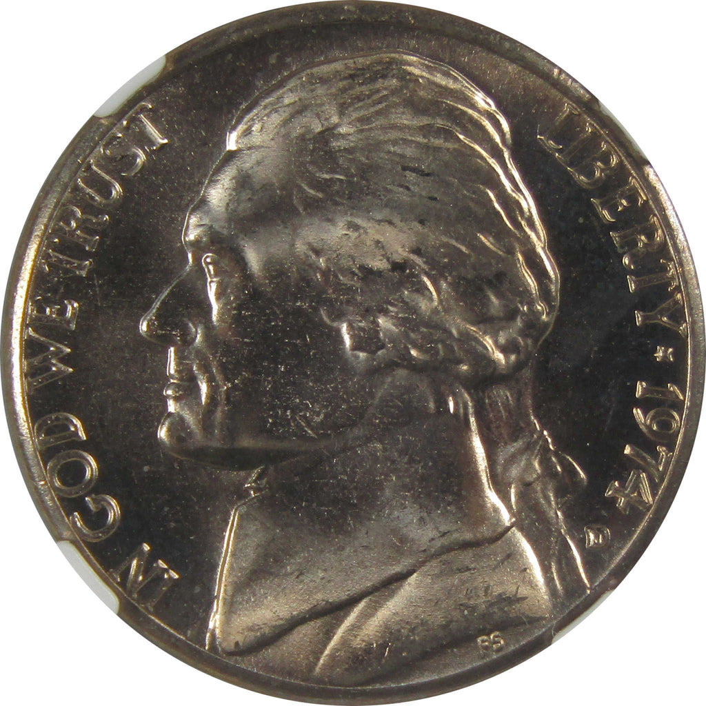 A genuine 1974 D Jefferson Nickel Coin, graded and certified MS 66 by NGC. Comes with a fragment of an original vintage canvas bag embedded in the label