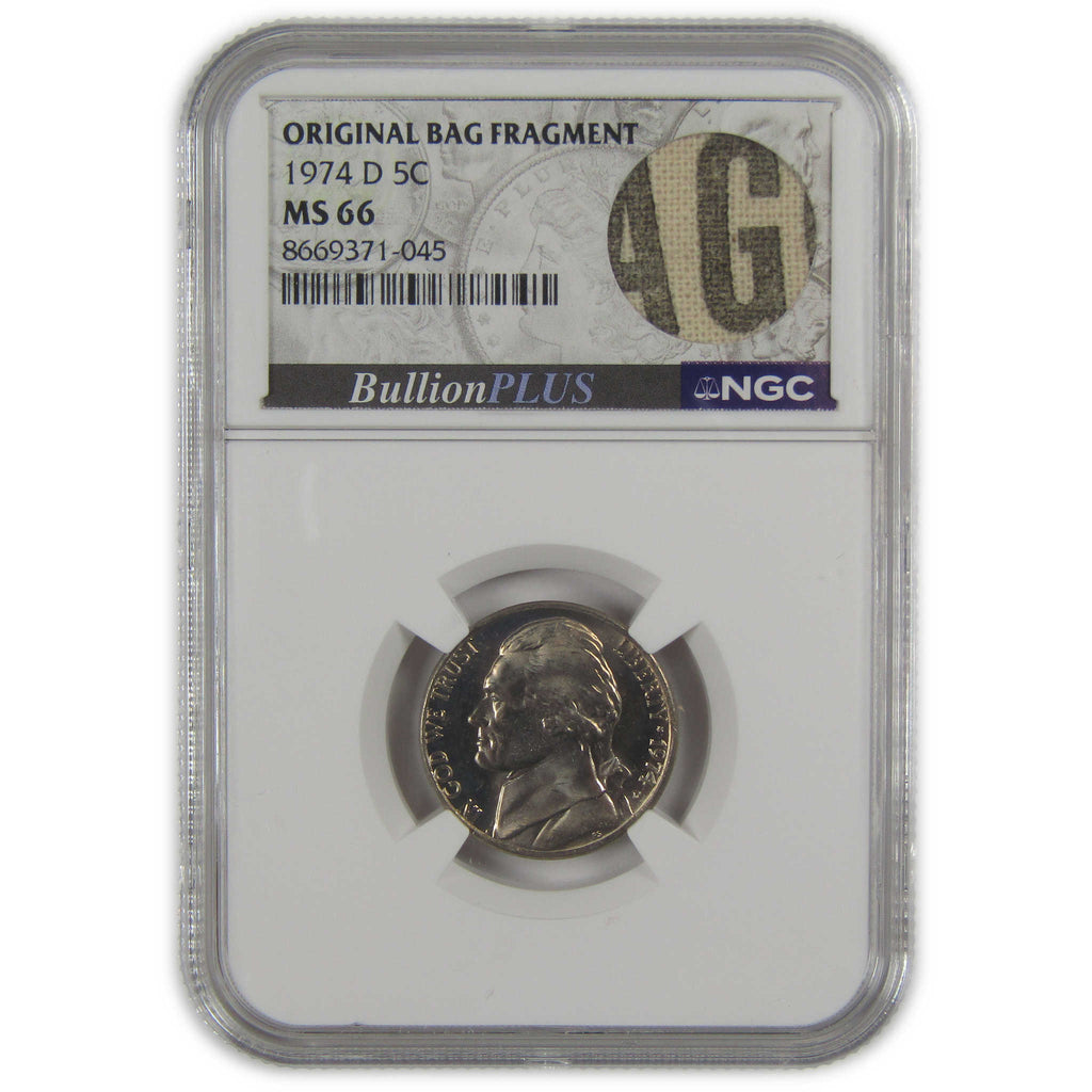 A genuine 1974 D Jefferson Nickel Coin, graded and certified MS 66 by NGC. Comes with a fragment of an original vintage canvas bag embedded in the label