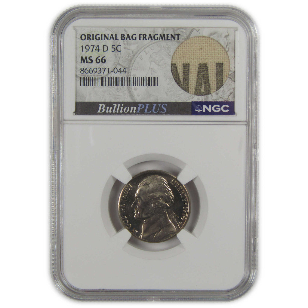 A genuine 1974 D Jefferson Nickel Coin, graded and certified MS 66 by NGC. Comes with a fragment of an original vintage canvas bag embedded in the label