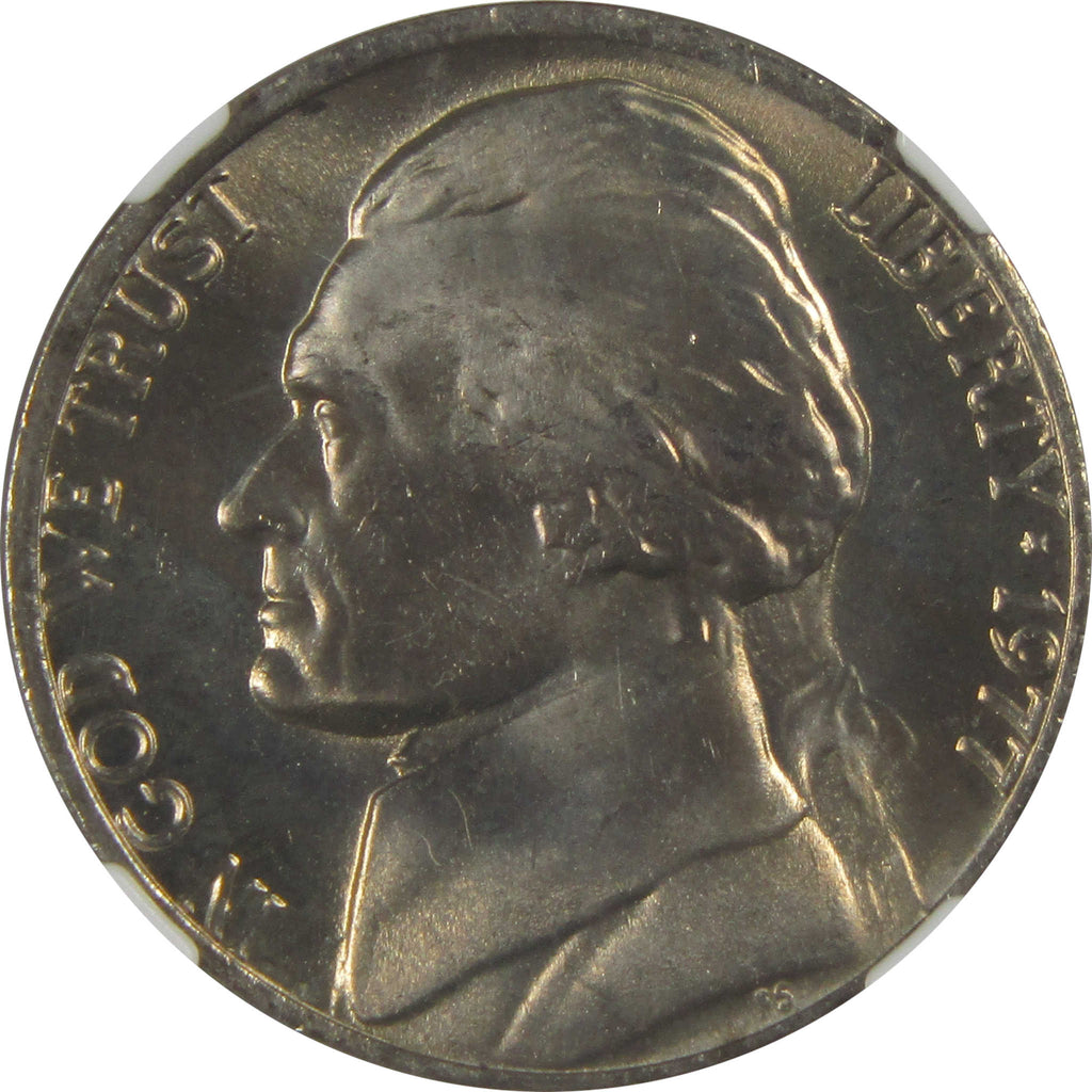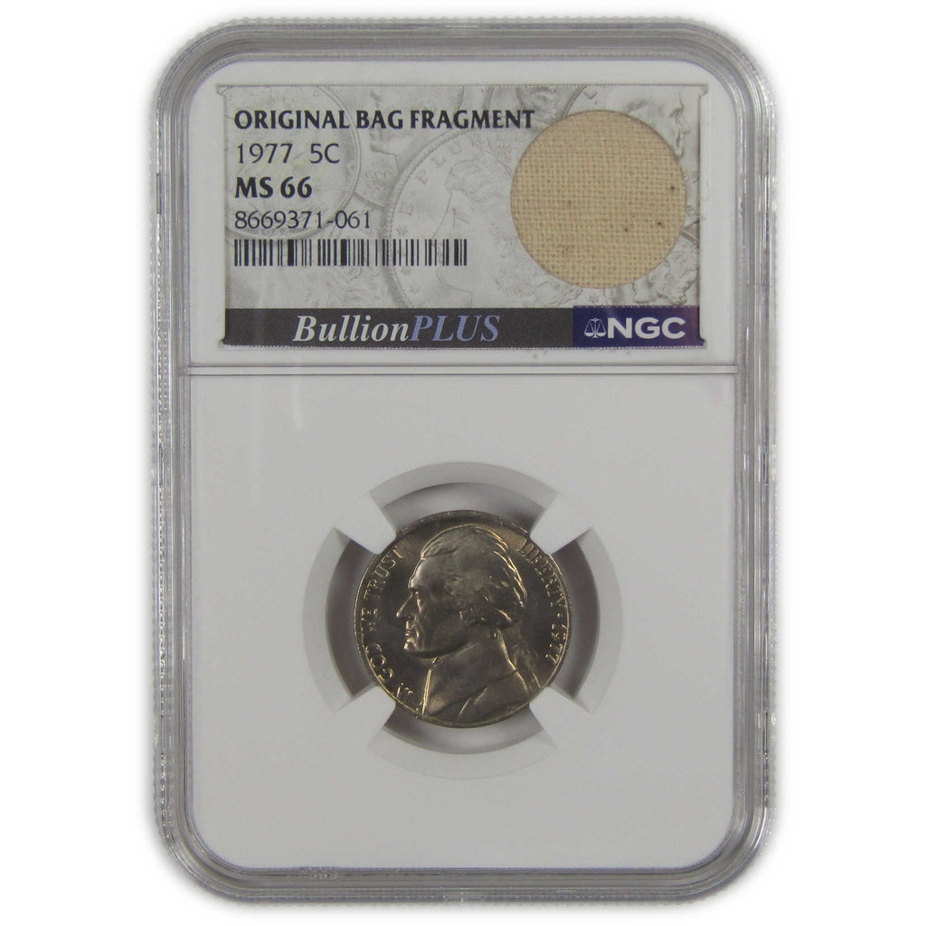 A genuine 1977 Jefferson Nickel Coin, graded and certified MS 66 by NGC. Comes with a fragment of an original vintage canvas bag embedded in the label