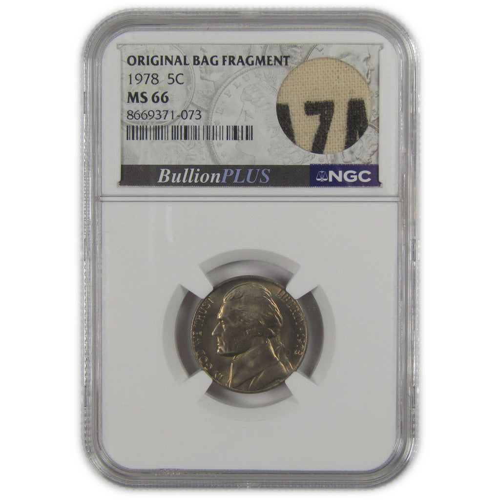 A genuine 1978 Jefferson Nickel Coin, graded and certified MS 66 by NGC. Comes with a fragment of an original vintage canvas bag embedded in the label