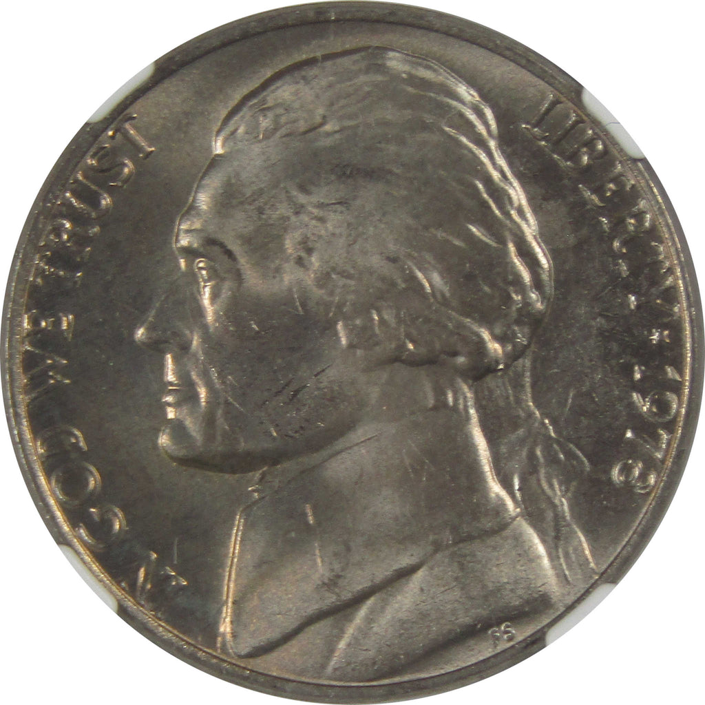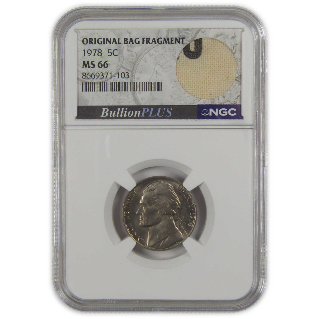 A genuine 1978 Jefferson Nickel Coin, graded and certified MS 66 by NGC. Comes with a fragment of an original vintage canvas bag embedded in the label