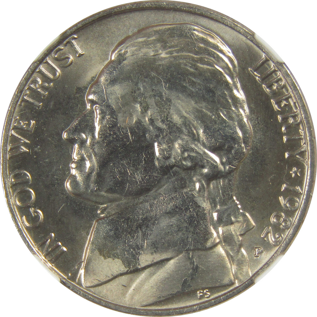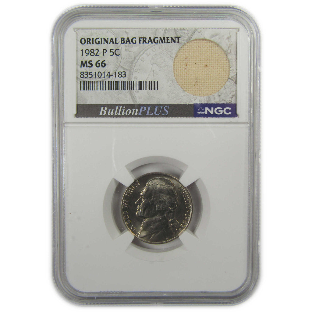A genuine 1982 P Jefferson Nickel Coin, graded and certified MS 66 by NGC. Comes with a fragment of an original vintage canvas bag embedded in the label