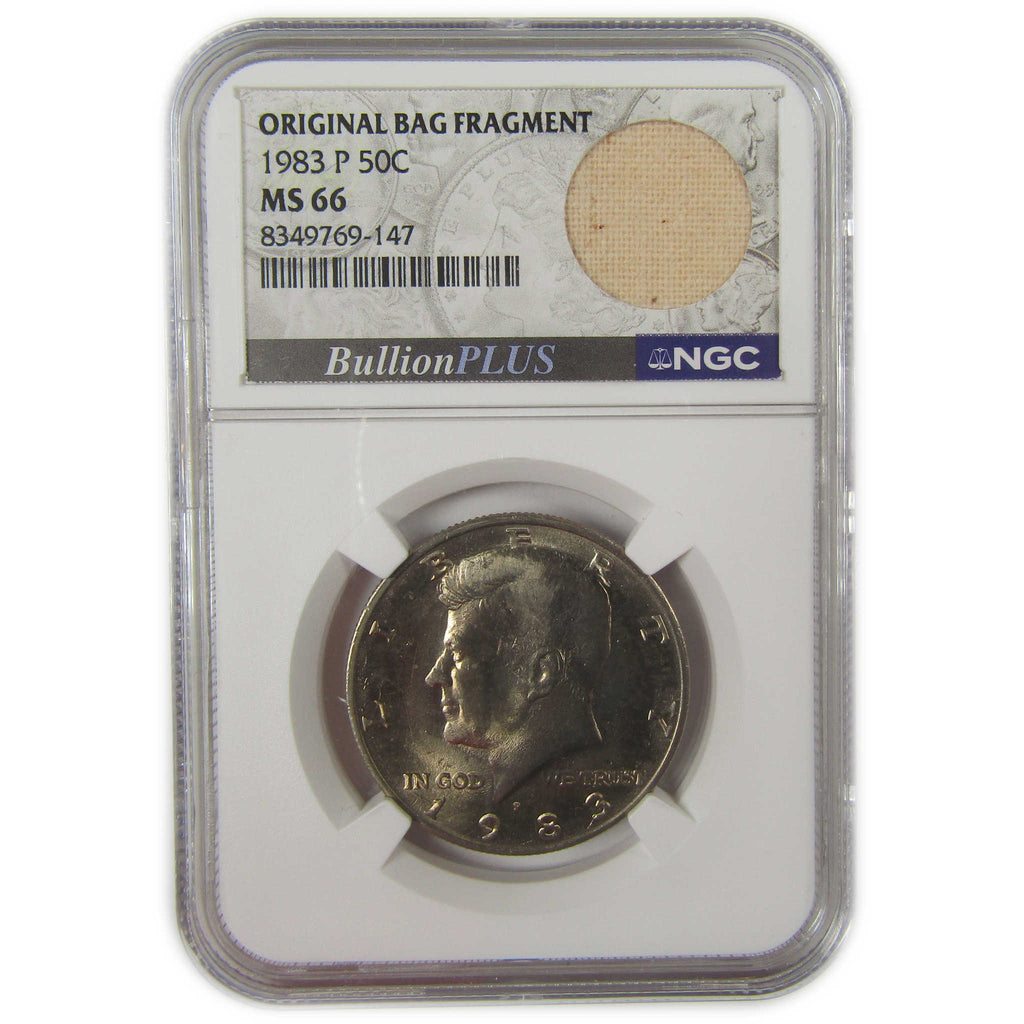 A genuine 1983 P Kennedy Clad Half Dollar Coin, graded and certified MS 66 by NGC. Comes with a fragment of an original vintage canvas bag embedded in the label.