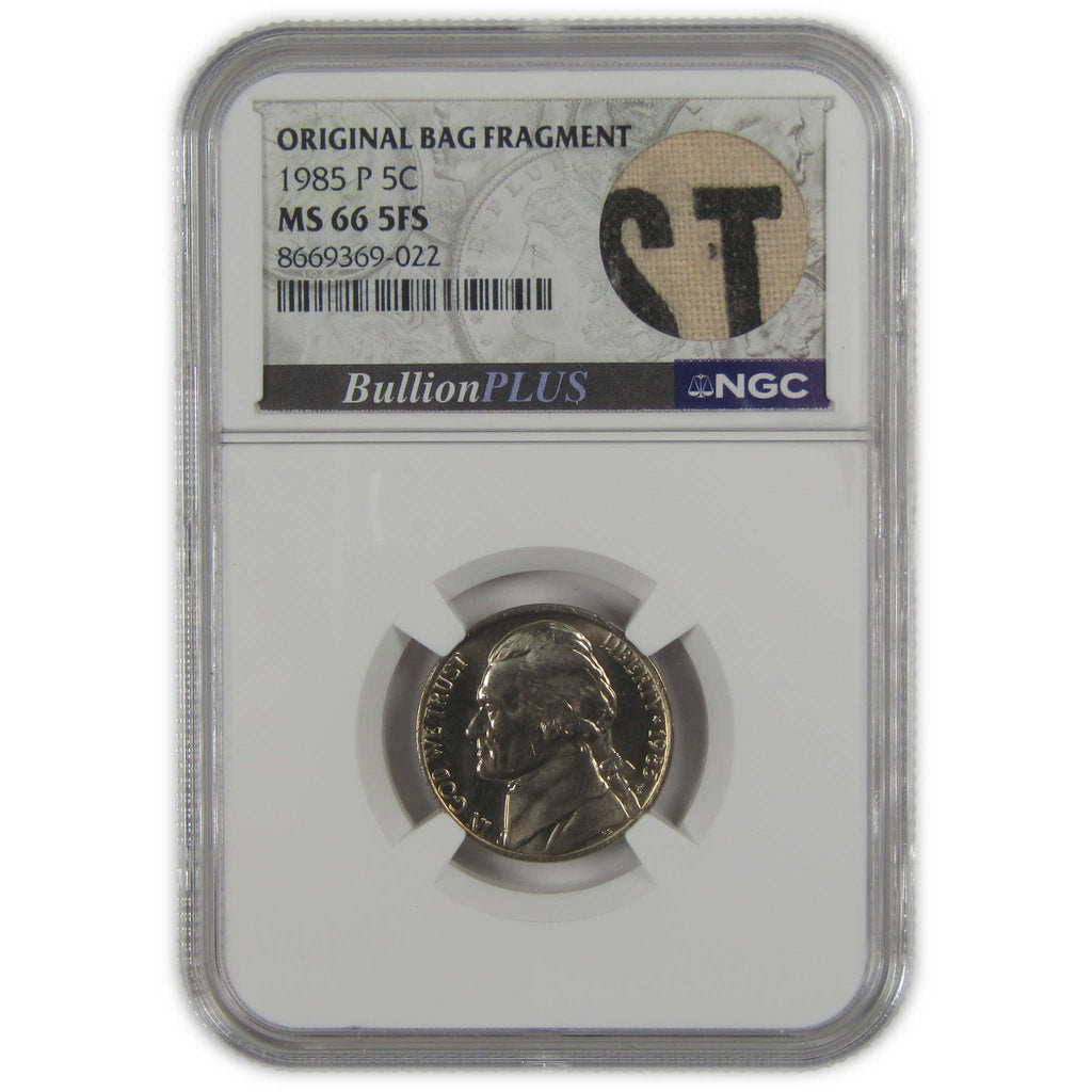 A genuine 1985 P Jefferson Nickel Coin, graded and certified MS 66 5FS by NGC. Comes with a fragment of an original vintage canvas bag embedded in the label