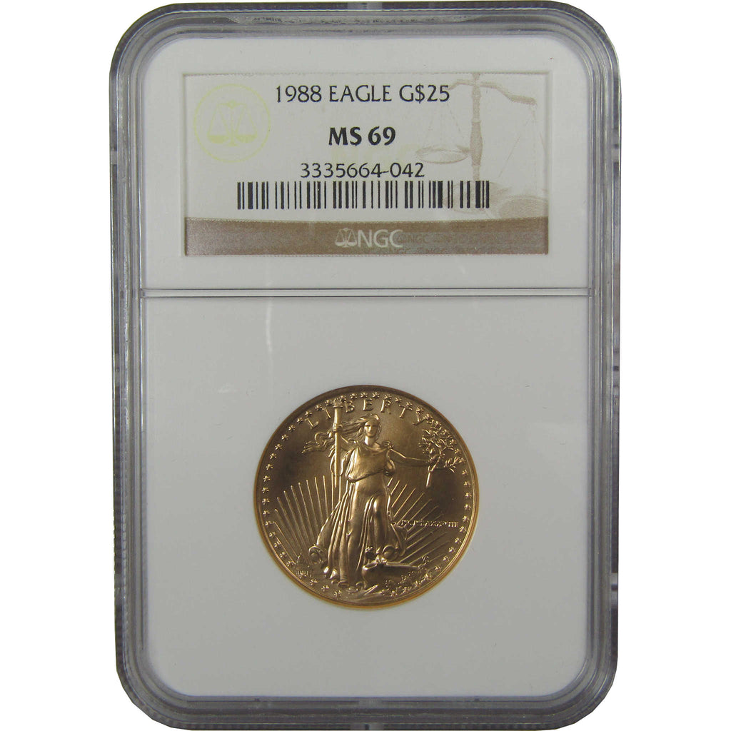 A genuine 1988 $25 American Eagle Gold Bullion Coin, graded and certified MS 69 by NGC. Contains 1/2 oz 0.9167 Gold