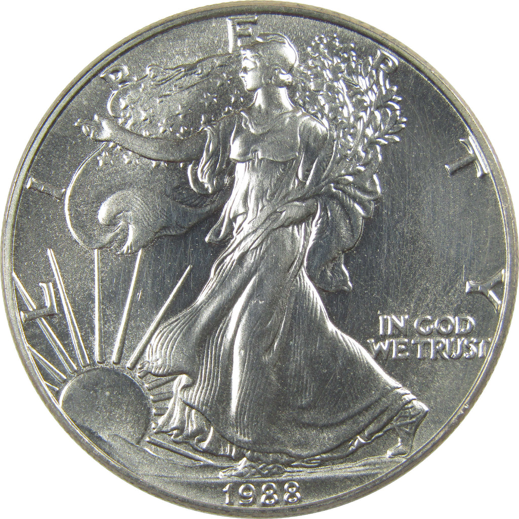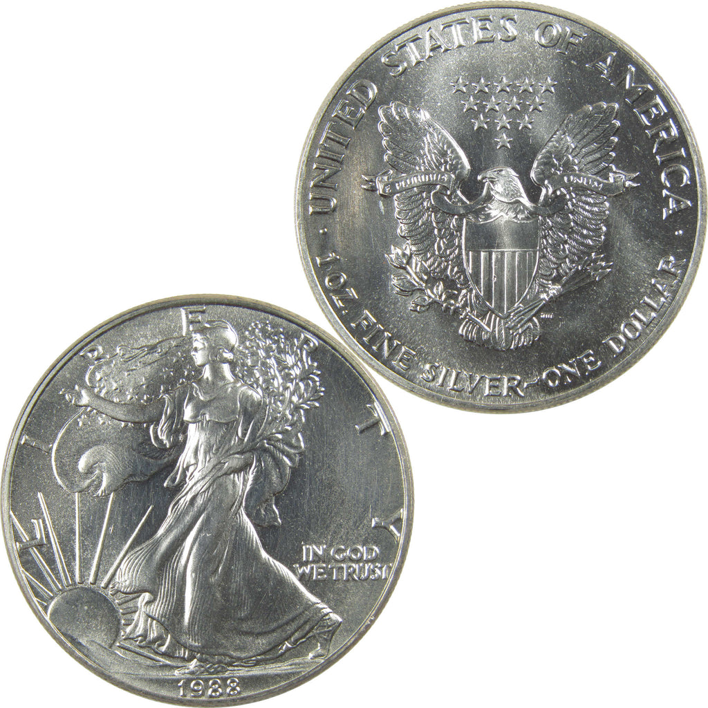 A genuine 1988 American Eagle Silver Dollar Bullion Coin, in Uncirculated Mint State Condition. Contains 1 oz 0.999 Silver