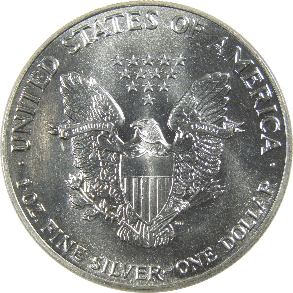 Struck in 1 troy ounce of 99.9% pure silver, this hefty American silver eagle bears the series' original designs. The obverse bears Adolph A. Weinman's beloved image of Liberty striding to greet the dawn of a new day. She wears a billowing gown of stars and stripes, and carries oak and laurel branches for military and civic glory. John Mercanti's striking reverse shows a heraldic eagle under a triangle of 13 stars. Encircling the reverse are UNITED STATES OF AMERICA and 1 OZ. FINE SILVER-ONE DOLLAR.