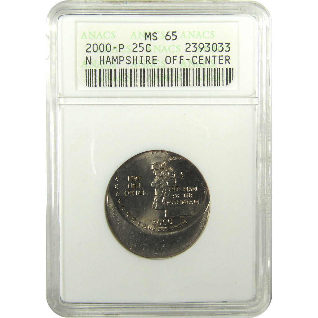 A genuine 2000 P New Hampshire State Clad Quarter Coin, graded and certified MS 65 by ANACS. Off Center Strike Mint Error